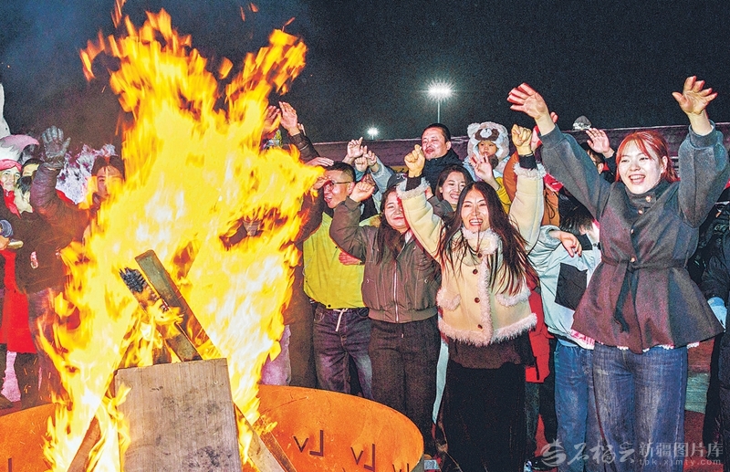 1月13日晚,乌鲁木齐市水磨沟区天山明月冰雪城,游客围着篝火载歌载舞。孙振嵩摄