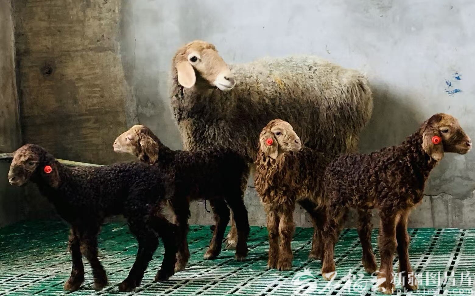 作为国家羊核心育种场,新疆西域沐羊人农牧科技有限公司2025年全年完成同期发情人工授精0.83万只,实现了皮山红羊两年三产、一胎多羔。图为该公司培育的“一母四羔”皮山红羊。王建国摄