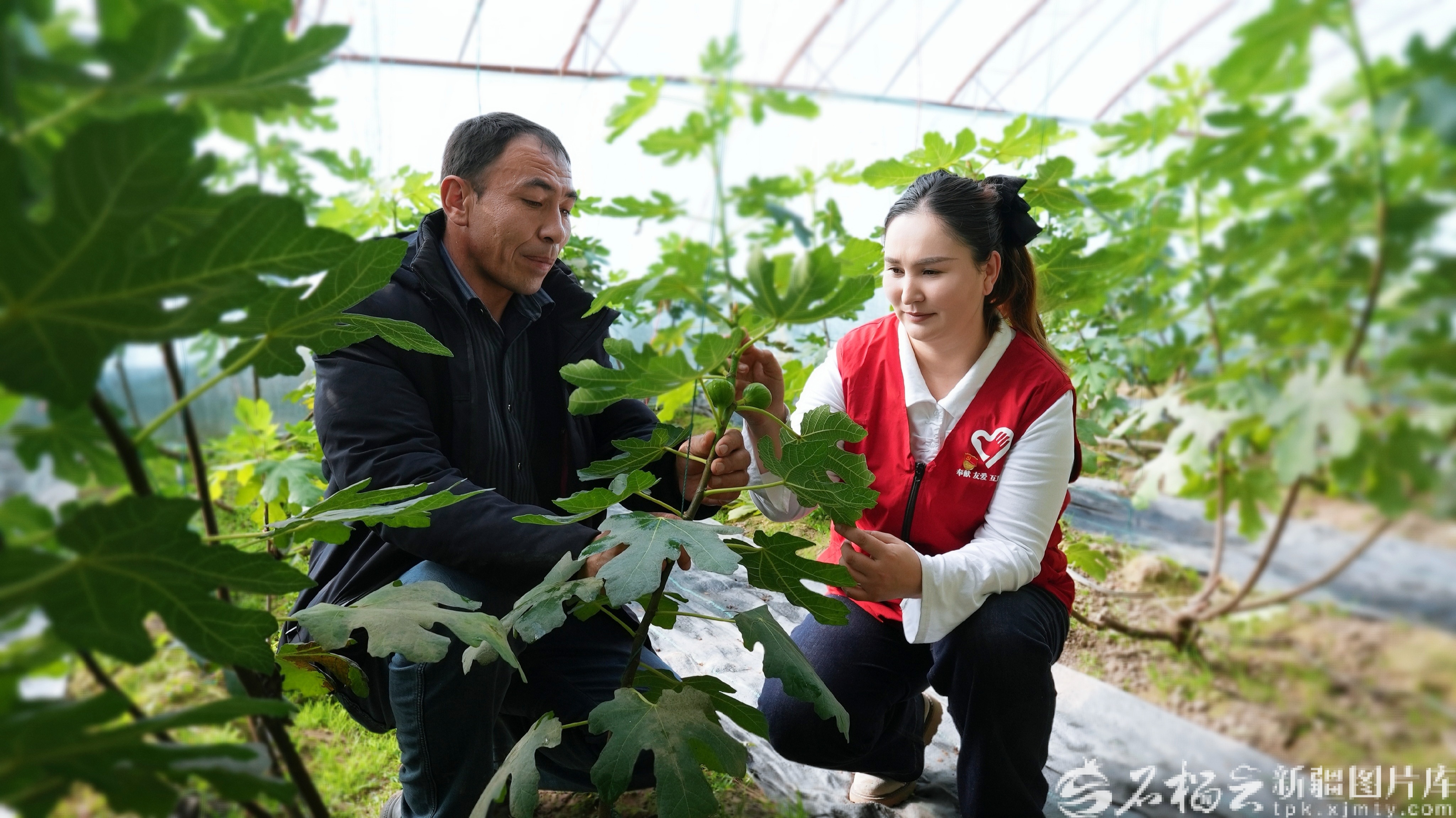 1月19日,阿克陶县恰尔隆镇昆仑佳苑温室大棚里,喀依孜村党总支书记哈丽帕·买买提吾(右)正在查看无花果的长势。方文静摄