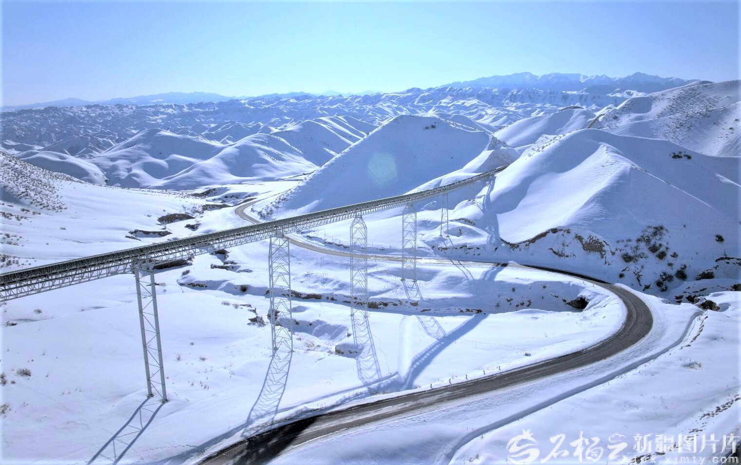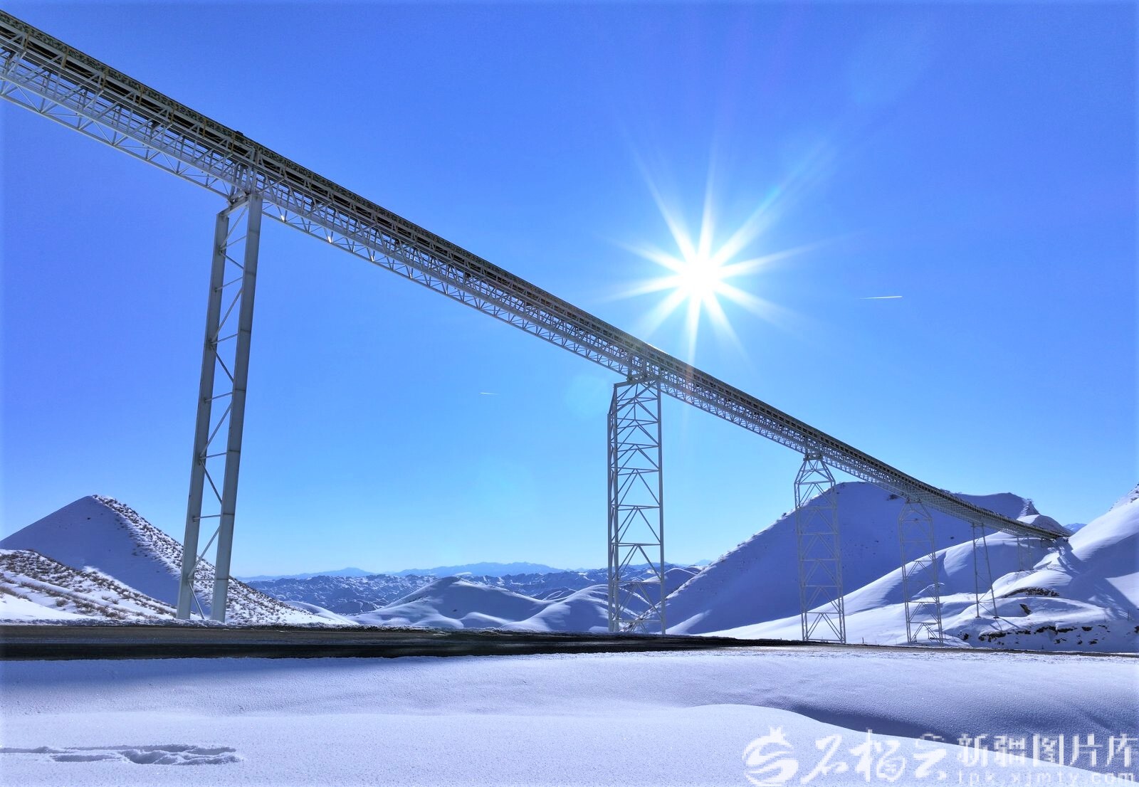 蓝天之下,天山之上,一条蜿蜒盘旋的输煤廊道如同“天桥”,从群山之间伸展出来,在蓝天和雪原映衬下,散射出光芒。