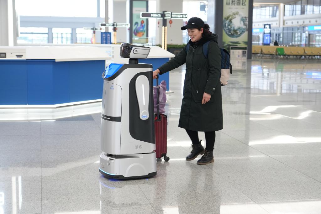 在福建南站,智能服务机器人“阿福”春运首日正式上岗,为乘客提供智慧出行体验。