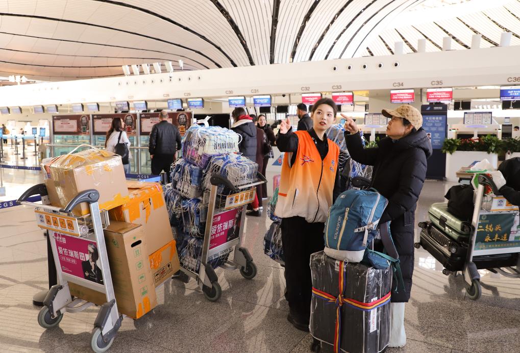 2月2日,安检志愿者在北京大兴国际机场协助旅客进行宠物托运。新华社发(王贺 摄)