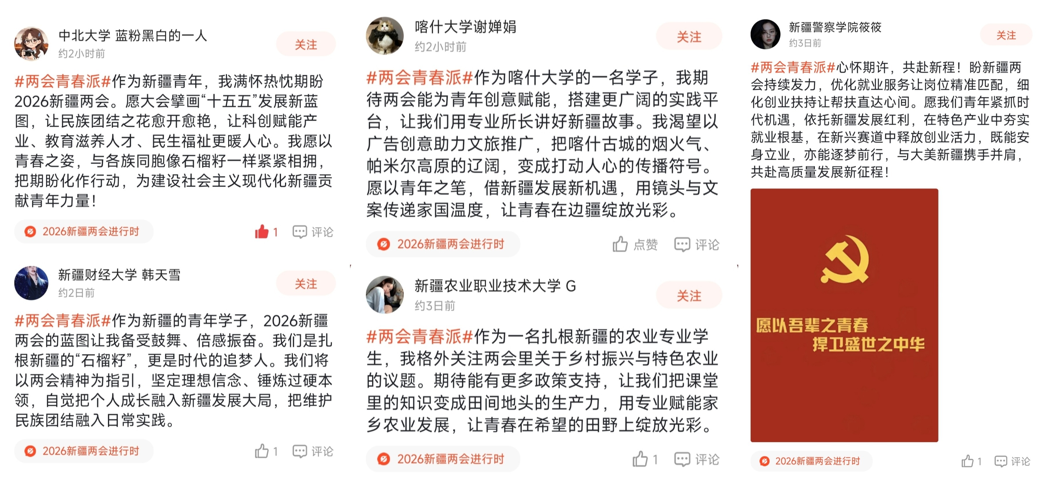 青年不仅是未来,更是时代的参与者和建言者。在2026年自治区两会召开期间,为助力青年朋友们牢牢把握时代机遇、融入新疆发展大局,1月24日,石榴云客户端联合自治区团委、石榴云新疆高校新媒体工作室(联盟),推出“两会青春派”2026年自治区两会石榴圈话题征集活动。截至2月2日,已累计有千余位高校师生参与话题讨论,他们围绕新疆发展各抒己见,展现出新时代青年的担当与智慧。