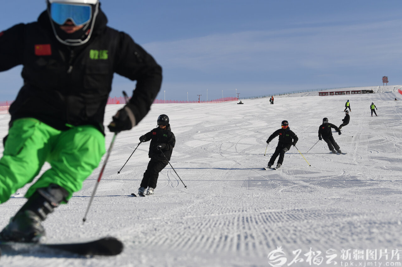 2月3日,额敏县也迷里滑雪场,教练为游客教授滑雪技巧。