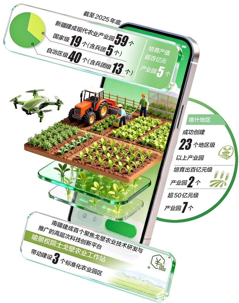在天山南北的广袤田野上,现代农业产业园正成为推动农业转型升级、激活乡村振兴动能的重要载体。截至2025年底,新疆建成现代农业产业园59个,包括国家级19个(含新疆生产建设兵团5个)、自治区级40个(含兵团级13个),培育产值超百亿元产业园5个,已构建起多层次、全覆盖的现代农业产业园发展格局。