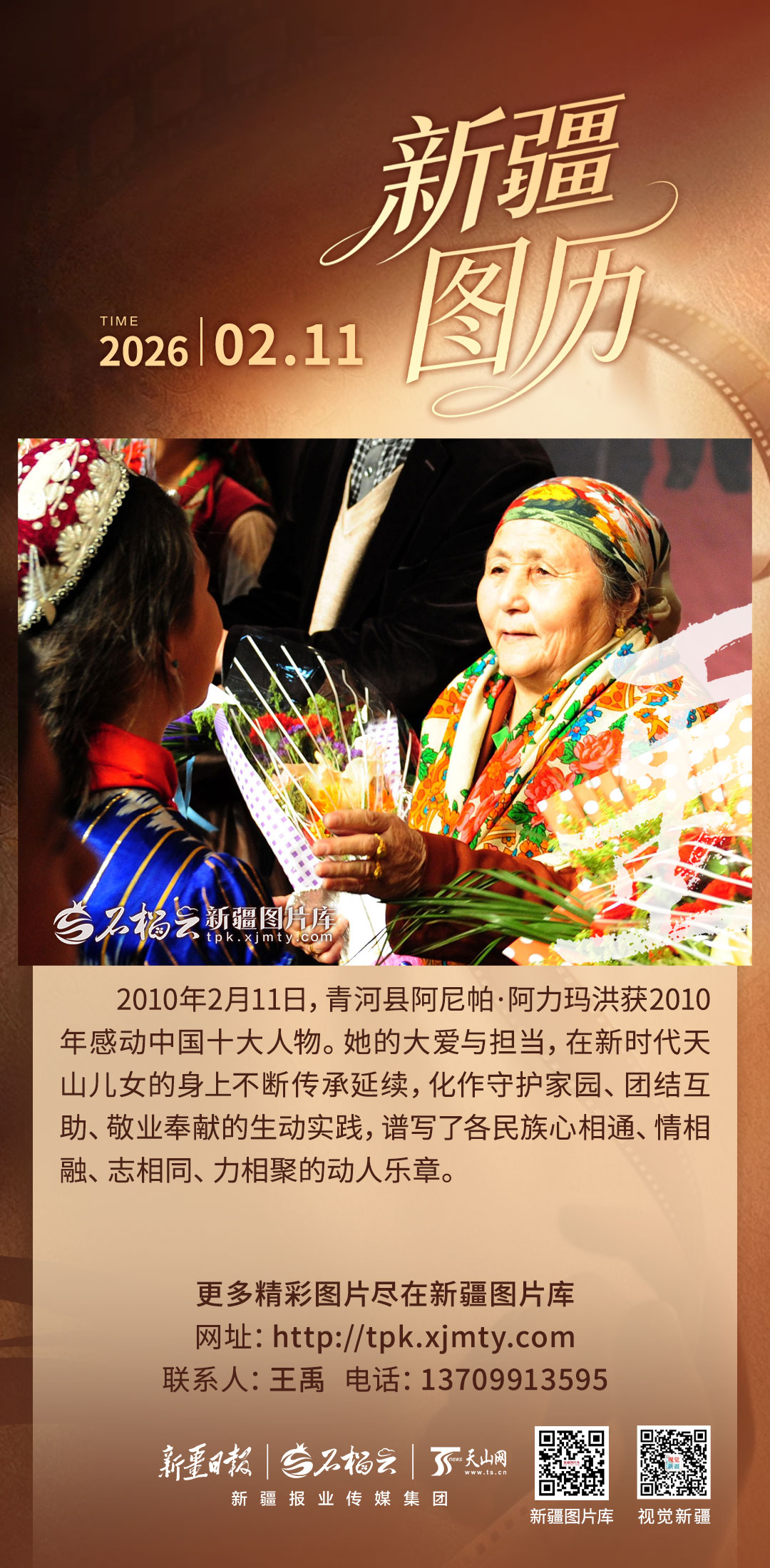 2010年2月11日,青河县阿尼帕·阿力马洪获2009年感动中国十大人物。上世纪60年代到80年代,阿尼帕和丈夫共养育了19个孩子,其中10个是他们收养的来自不同民族的孤儿。如今,她家里已经四世同堂,200多人,她把小家庭的爱写成了一首民族团结的诗。