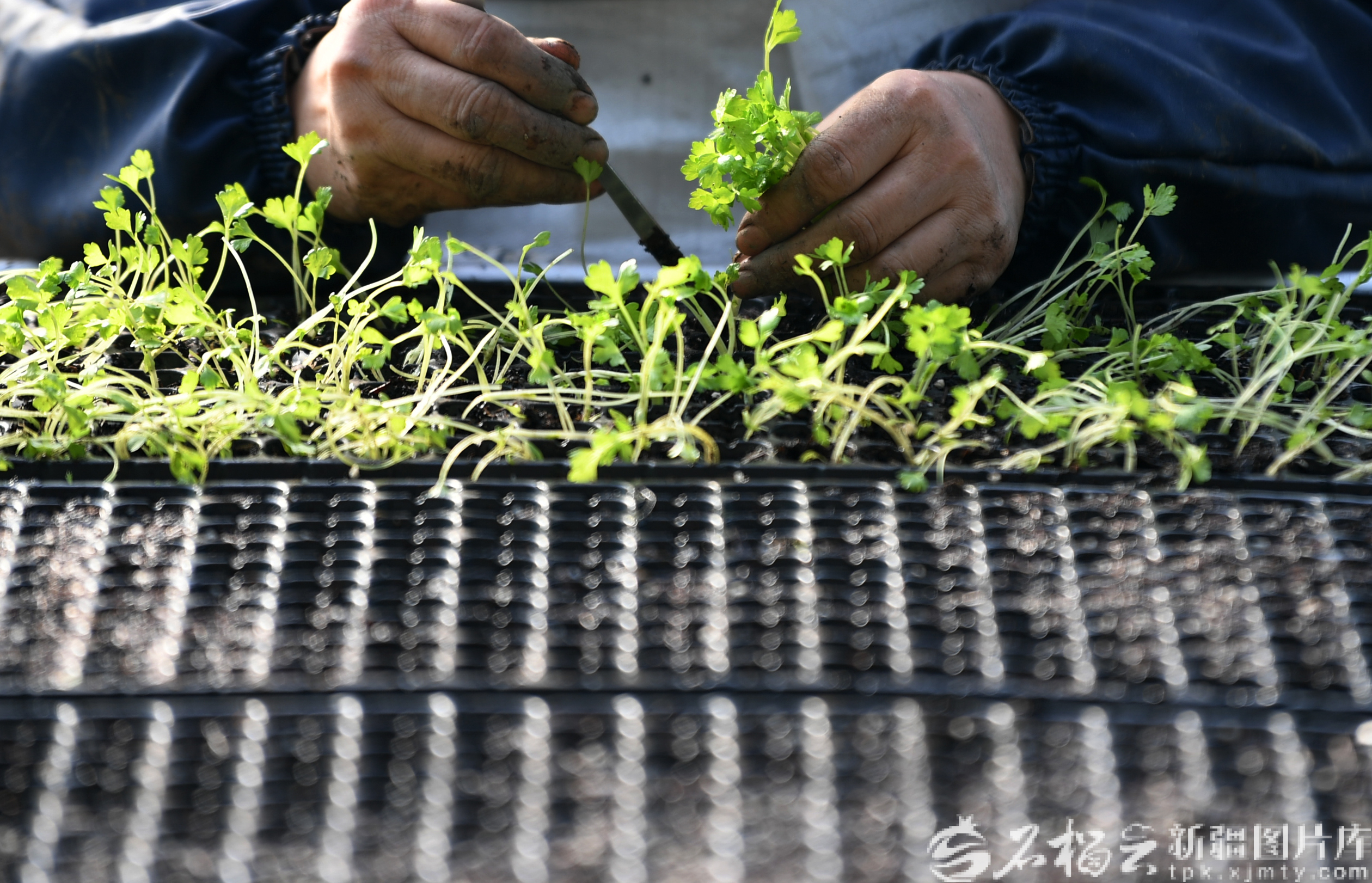 2月12日,在乌鲁木齐高新区(新市区)青格达湖乡新联村的清洁能源智能温室里,村民在播种芹菜。