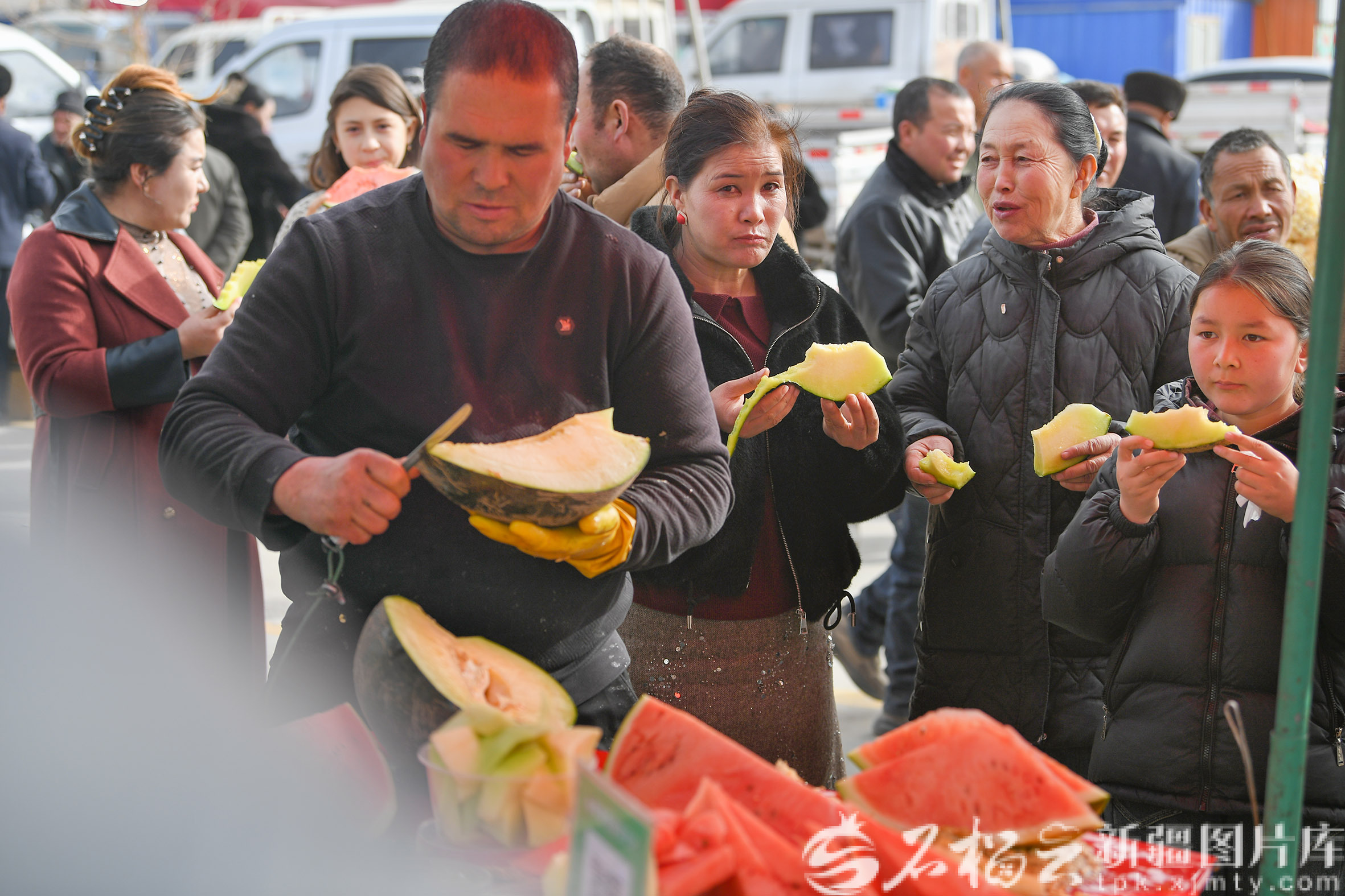 2月11日,村民在皮山县木吉镇巴扎上品尝甜瓜。