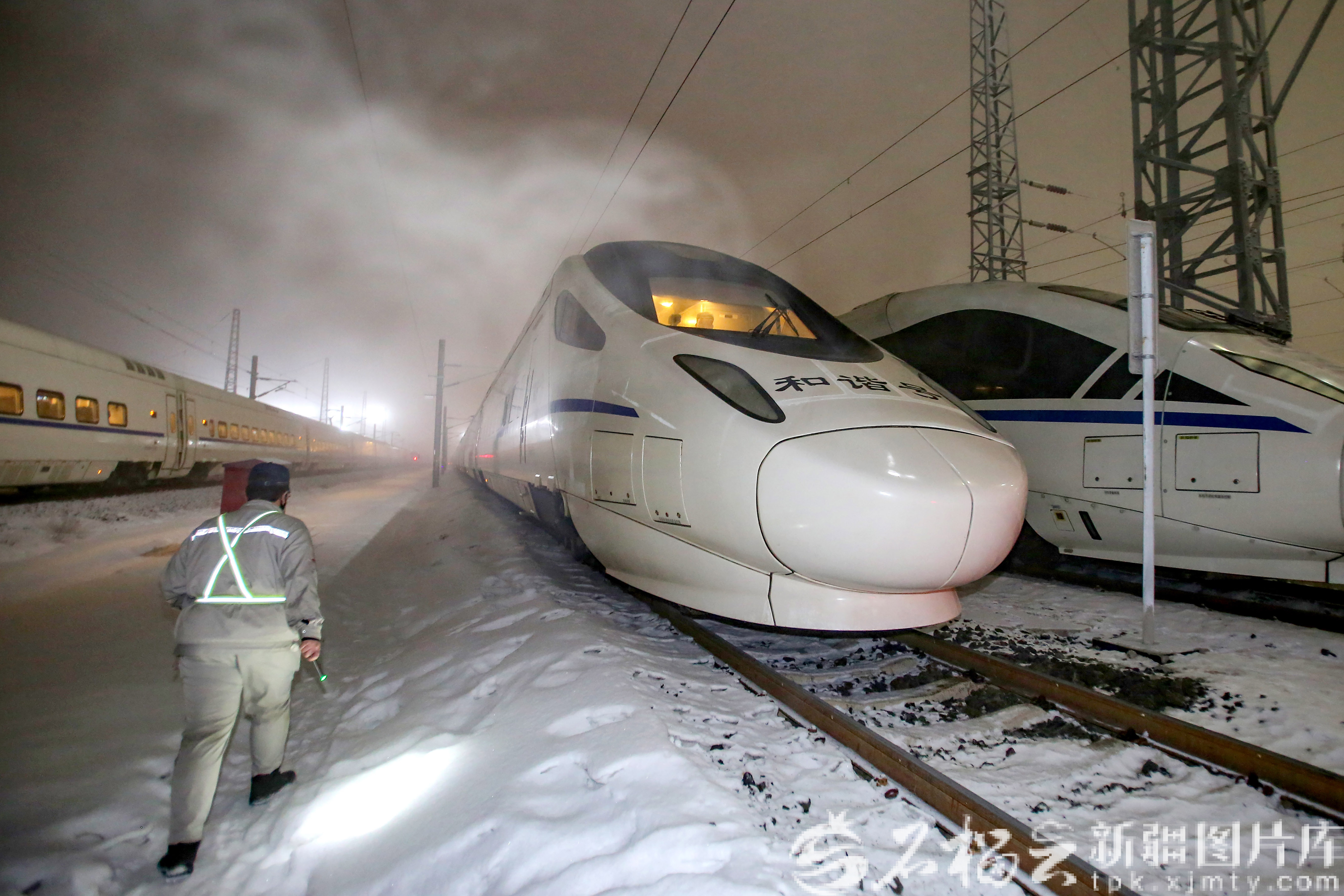 2月5日,机械师在存车场巡视检查整装待发的动车组列车,他们每两小时要对存车场的动车组列车进行防寒打温,时刻保障动车组列车的良好状态。