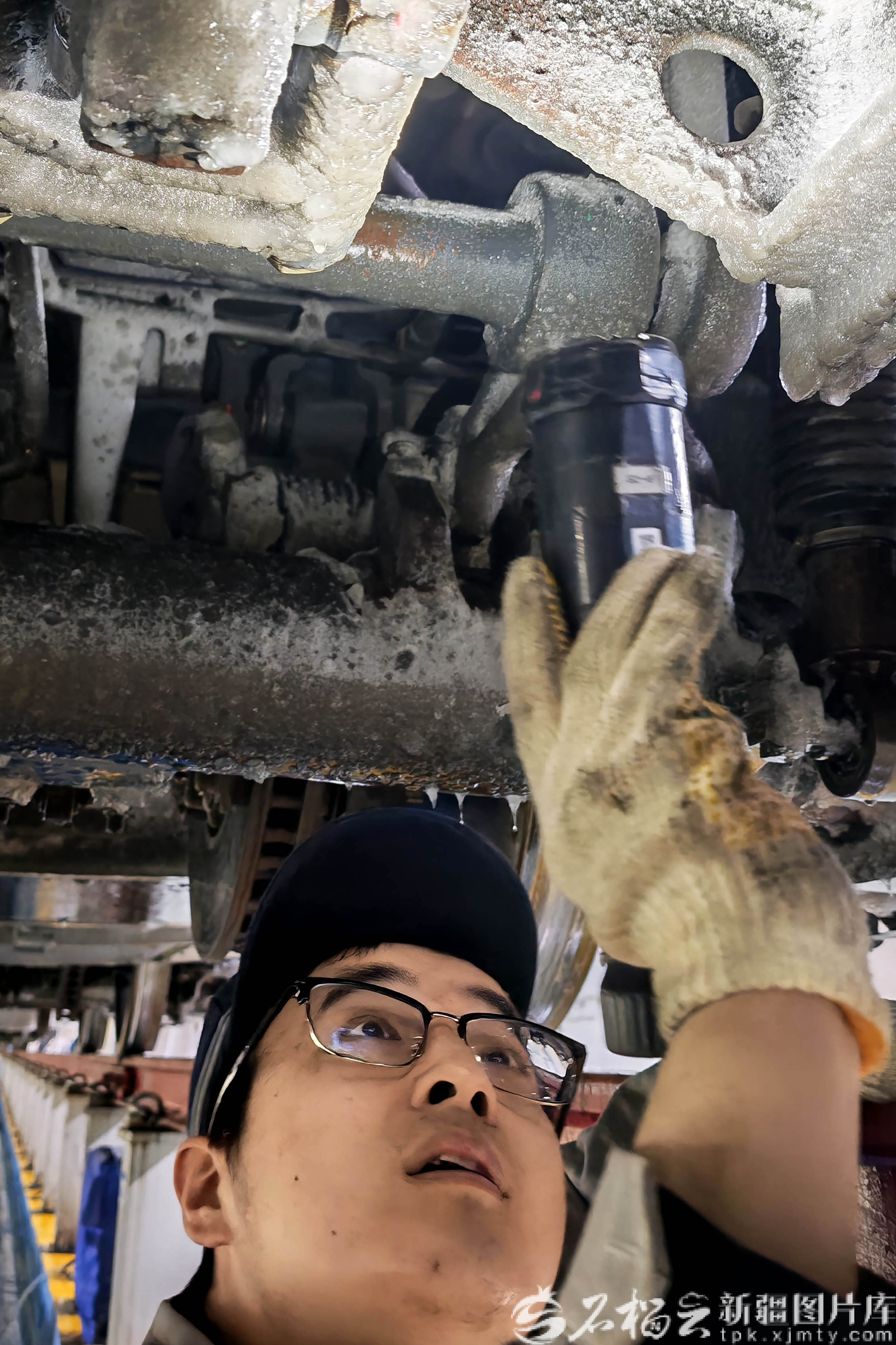 2月4日,机械师阿里木·衣明在动车底为检查维护完成的动车部件做安全标记,阿里木在这里经过了11年的锻炼已成为动车片区的行家里手。