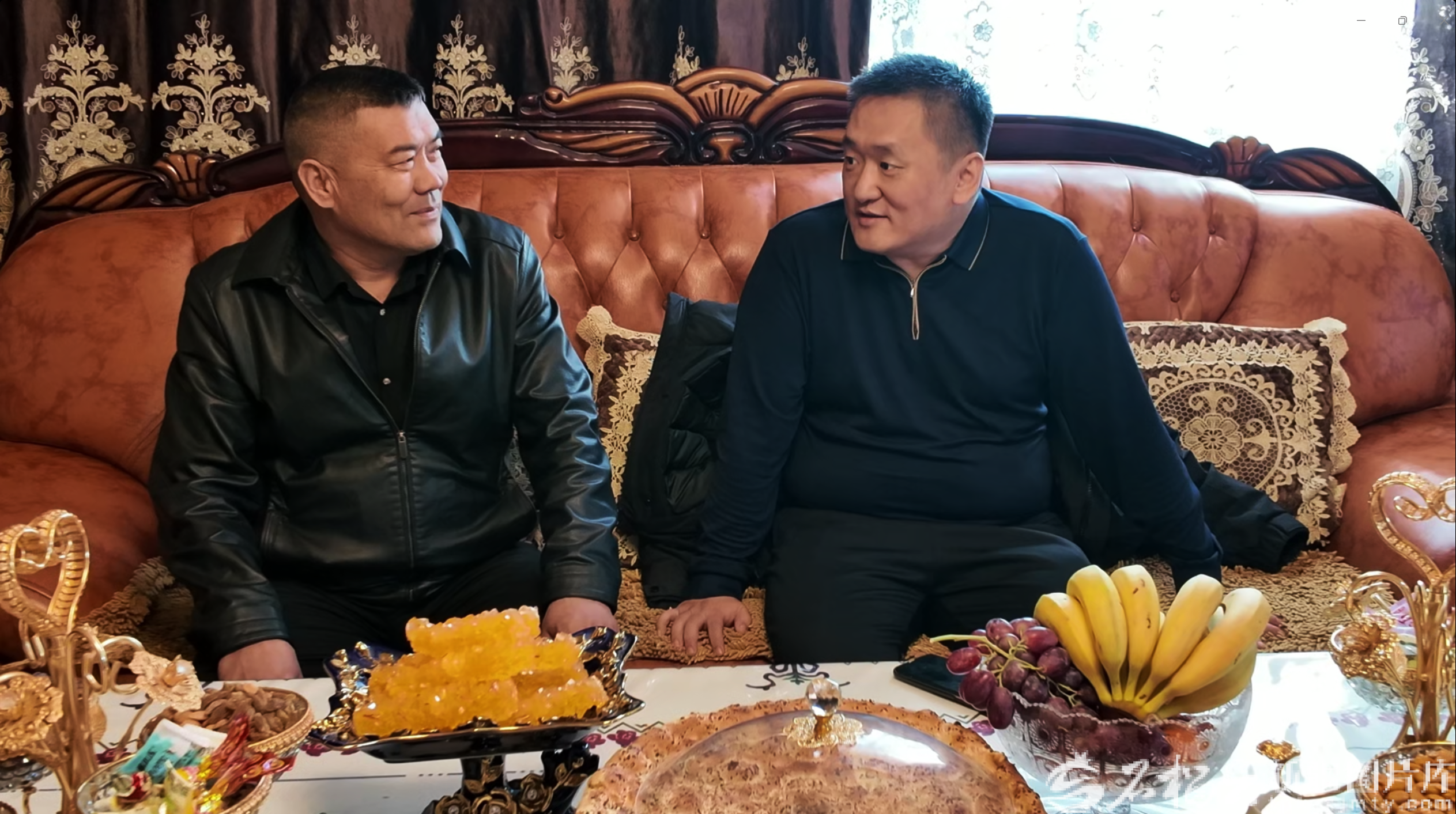 2月16日,尉犁县兴平镇达西村石榴巷,记者赵卫斌(右)在村民阿不力克木·木沙家中采访交流。帕日哈提·阿不力米提 摄