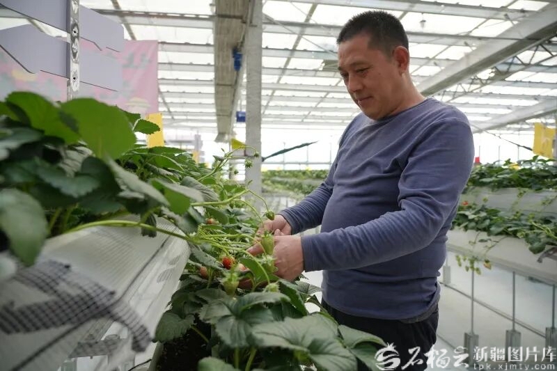 2月17日,在位于塔城市二工镇奇巴拉尕什村的新疆乐昊农业科技有限公司智慧农业基地核心阳光大棚内,技术人员正在给草莓修剪植株。代娇美 摄