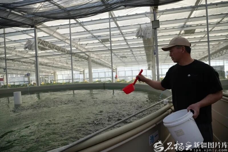 2月17日,在位于塔城市二工镇奇巴拉尕什村的新疆乐昊农业科技有限公司智慧农业基地核心阳光大棚内,技术人员正在给鱼喂食。代娇美 摄