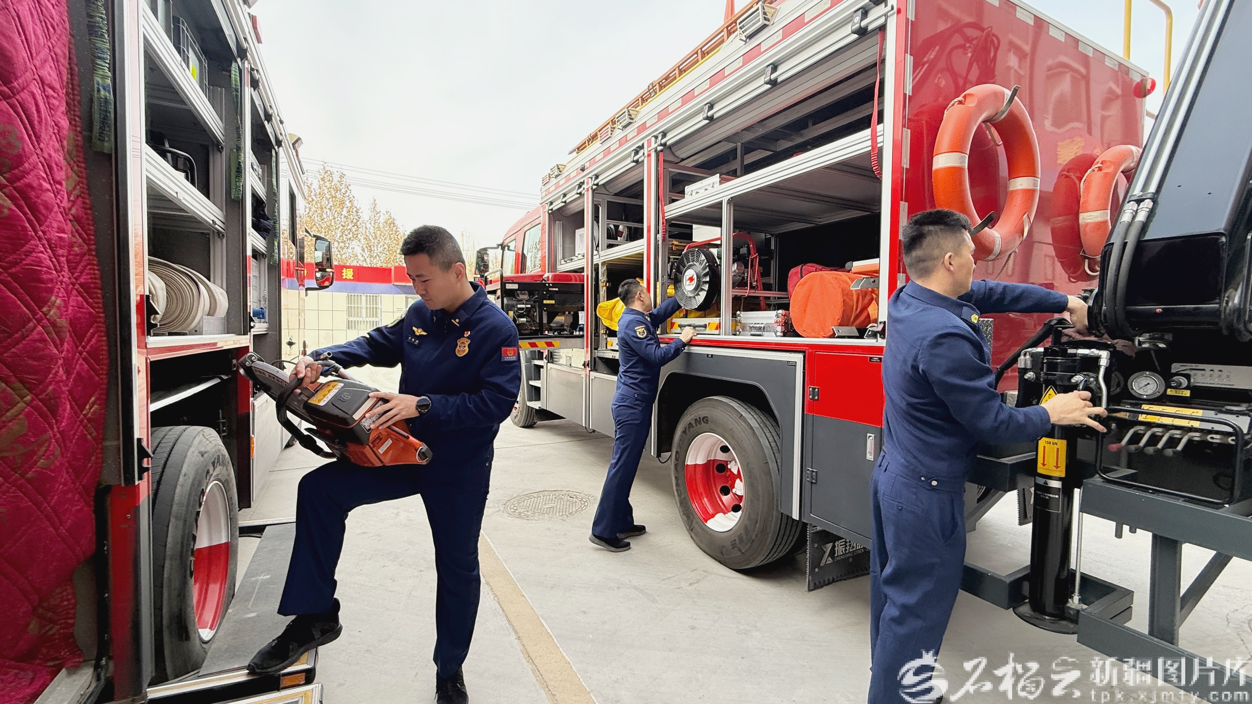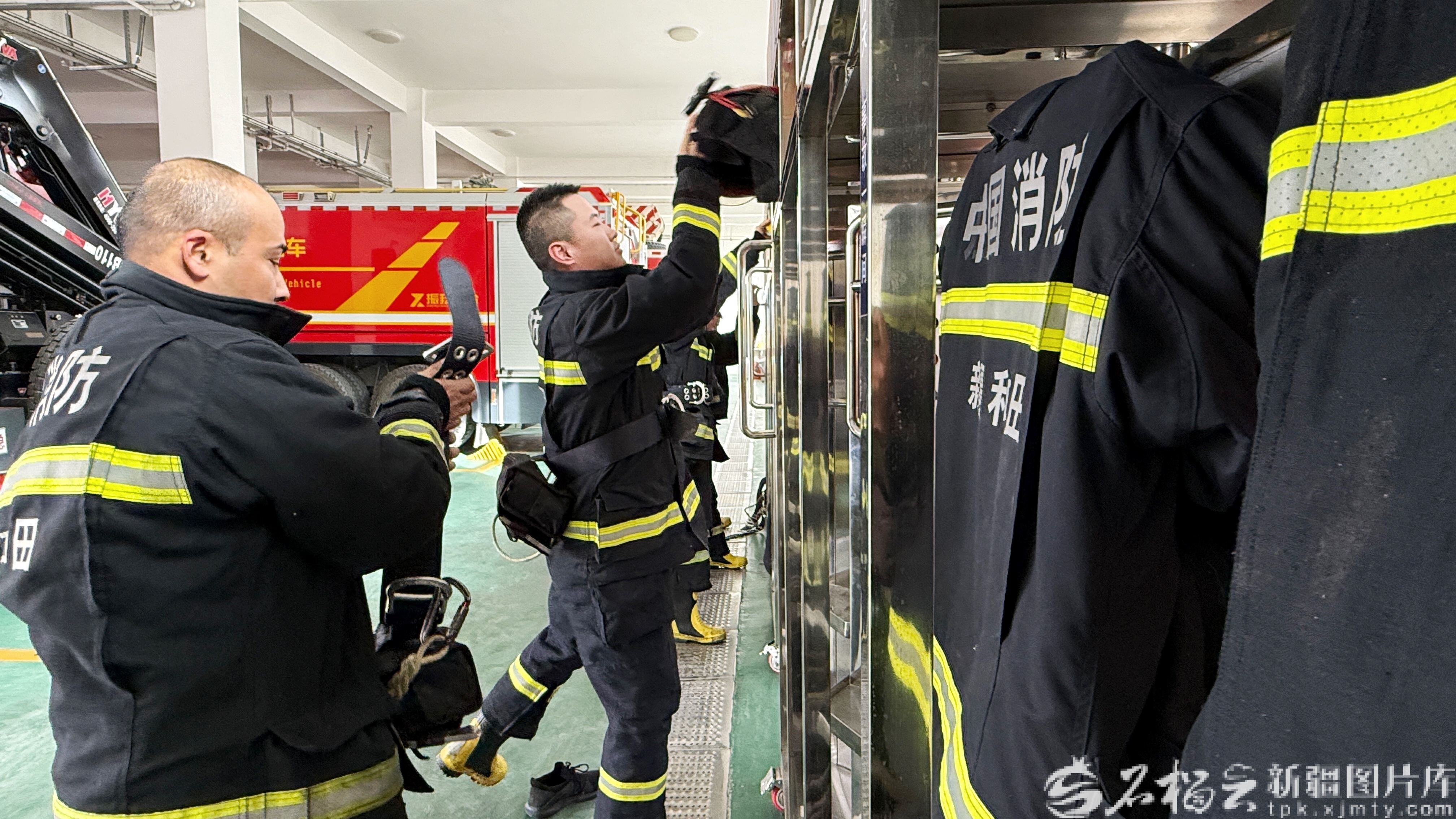 2月12日,在和田市消防救援大队古江北路消防救援站,谭旭东(左一)和队员们正在对消防救援车进行检查。王雪莲 摄