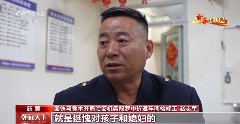 国铁乌鲁木齐局哈密机务段罗中折返车间检修工 赵志军:只要我回家,基本上都是我陪孩子,但是来这就是挺愧对孩子和媳妇的。过新年了,也是想给媳妇说,媳妇,有你的地方就是家,你在家辛苦了。