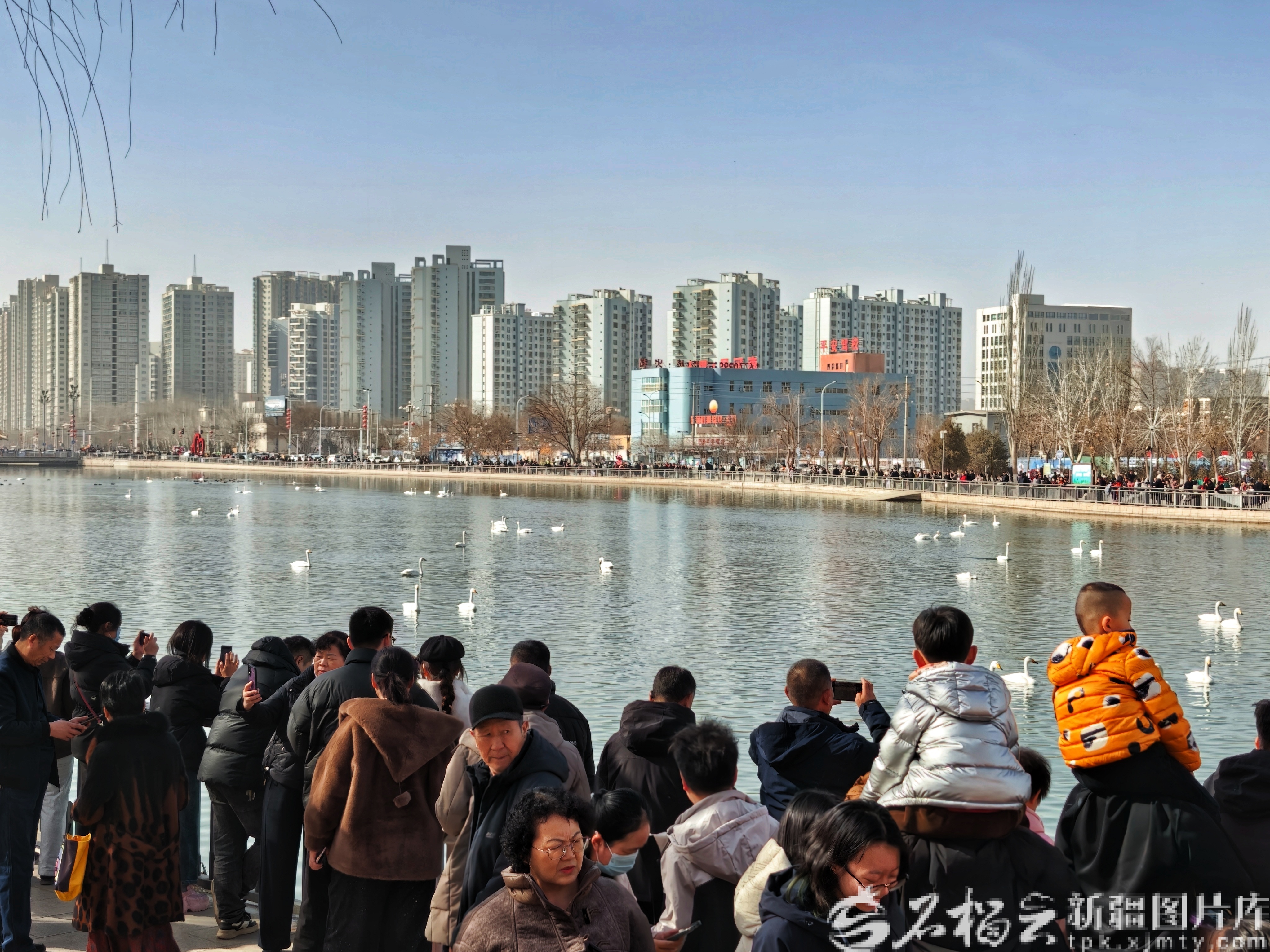 2月21日,游客在库尔勒市杜鹃河畔观赏天鹅。石榴云/新疆日报记者 杜建辉摄