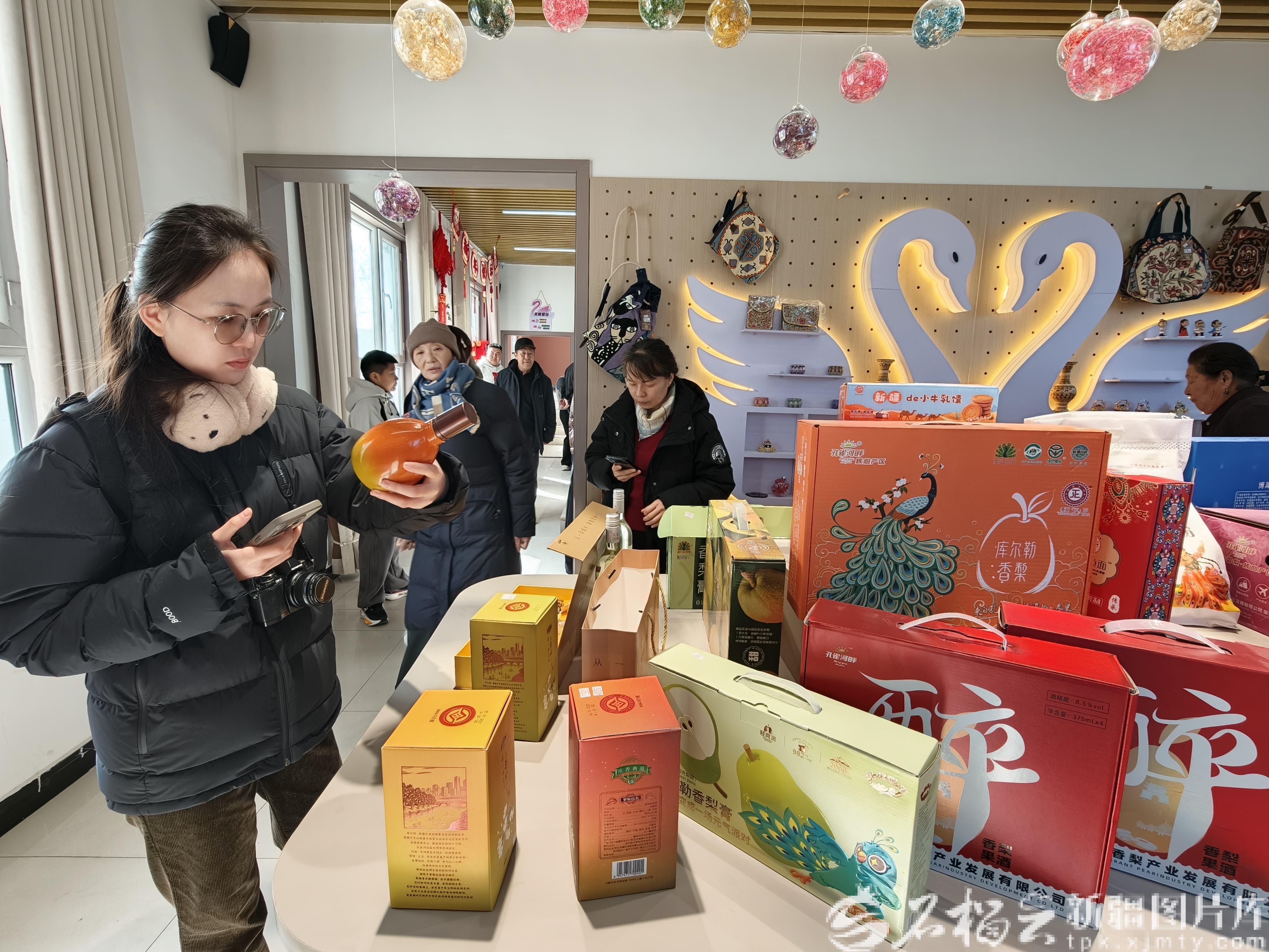 2月21日,游客在库尔勒市杜鹃河畔的天鹅驿站选购文创产品。石榴云/新疆日报记者 杜建辉摄