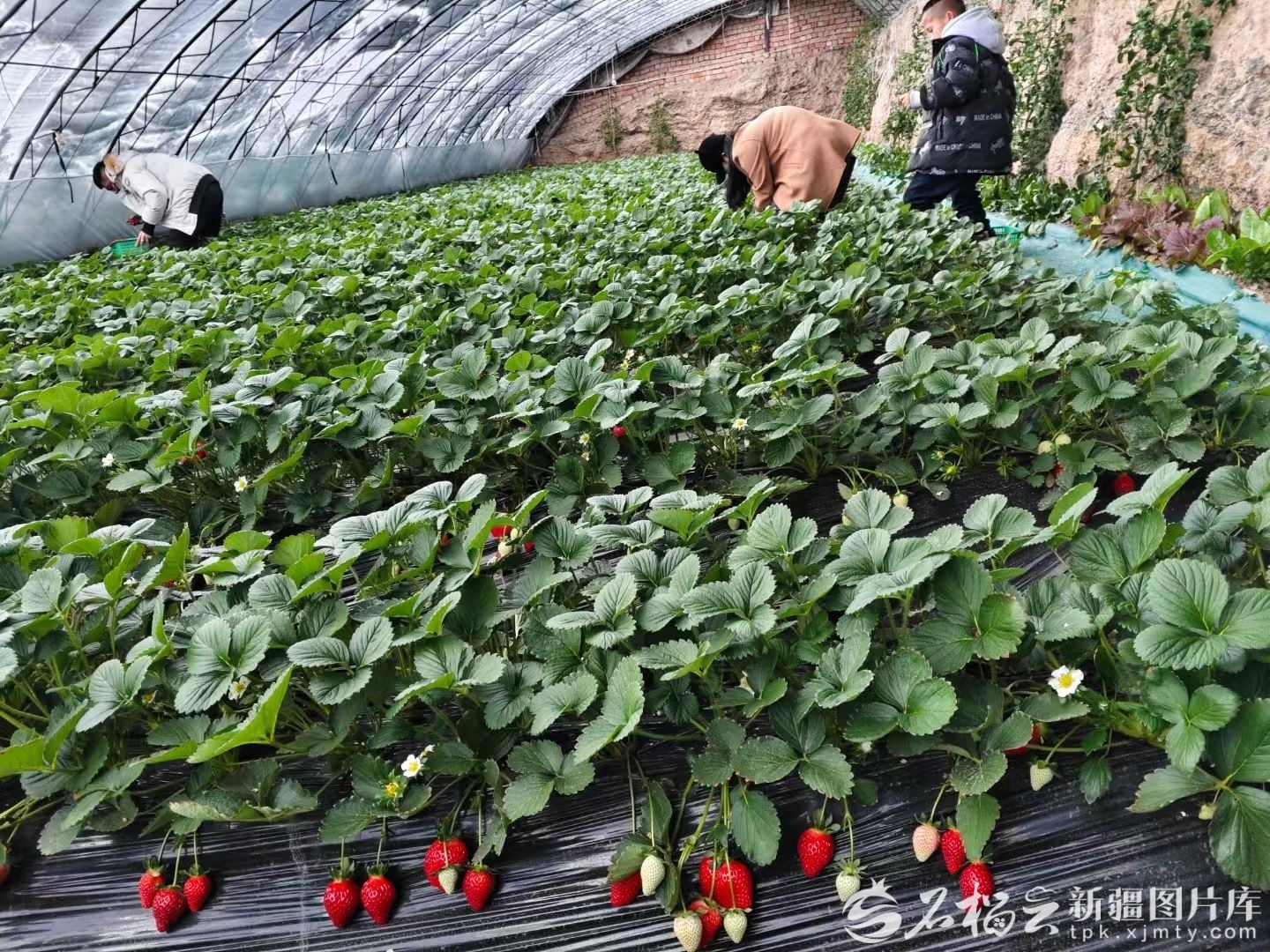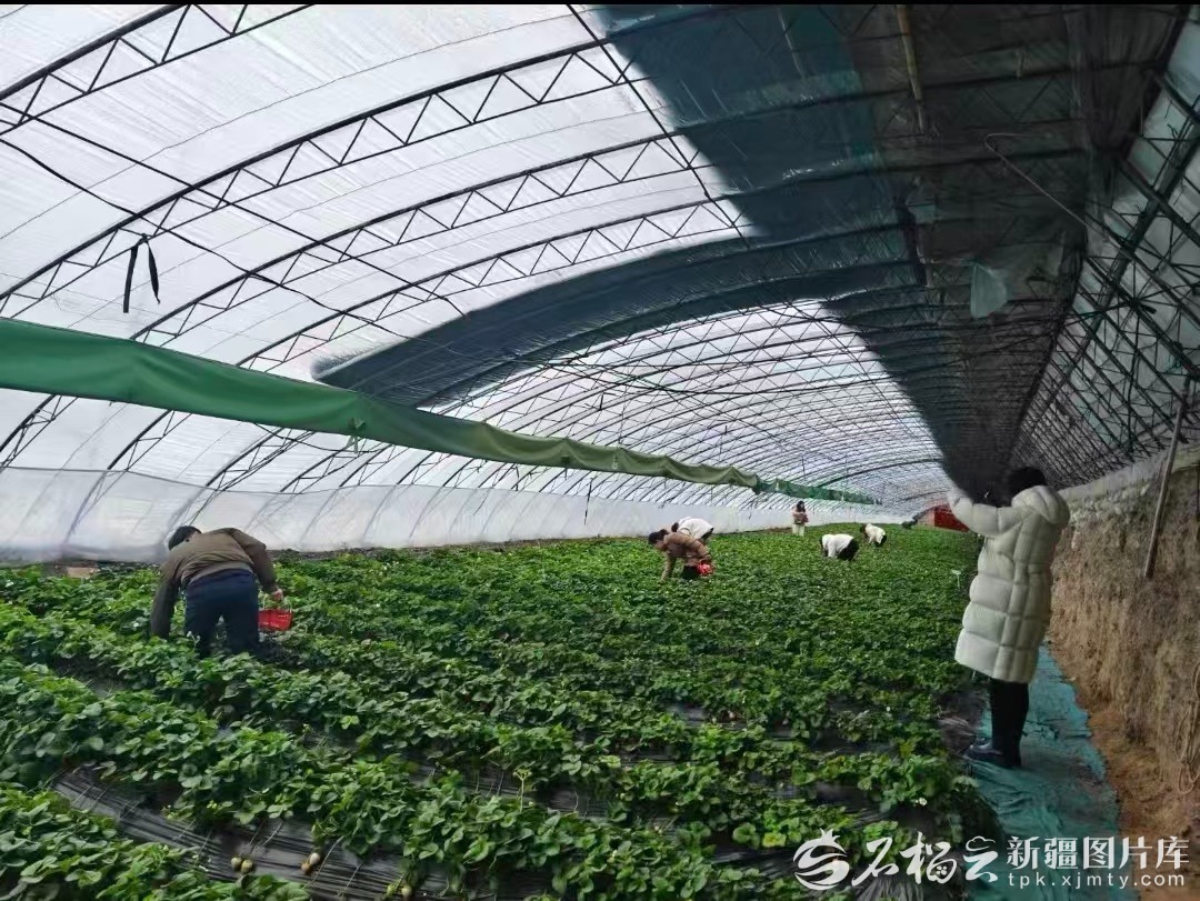 游客正在摘草莓。石榴云/新疆日报记者 王新红摄
