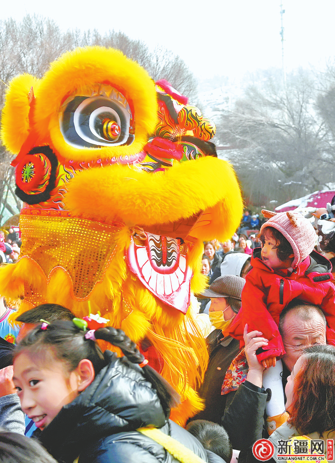 2月21日,在水磨沟公园,社火队员舞起狮子和游客互动。(记者陈岩摄)