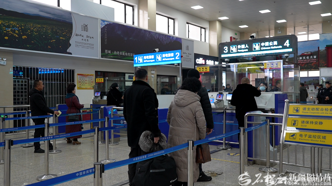 巴克图口岸出入境大厅内,游客有序排队办理出境查验手续。道·道图那摄