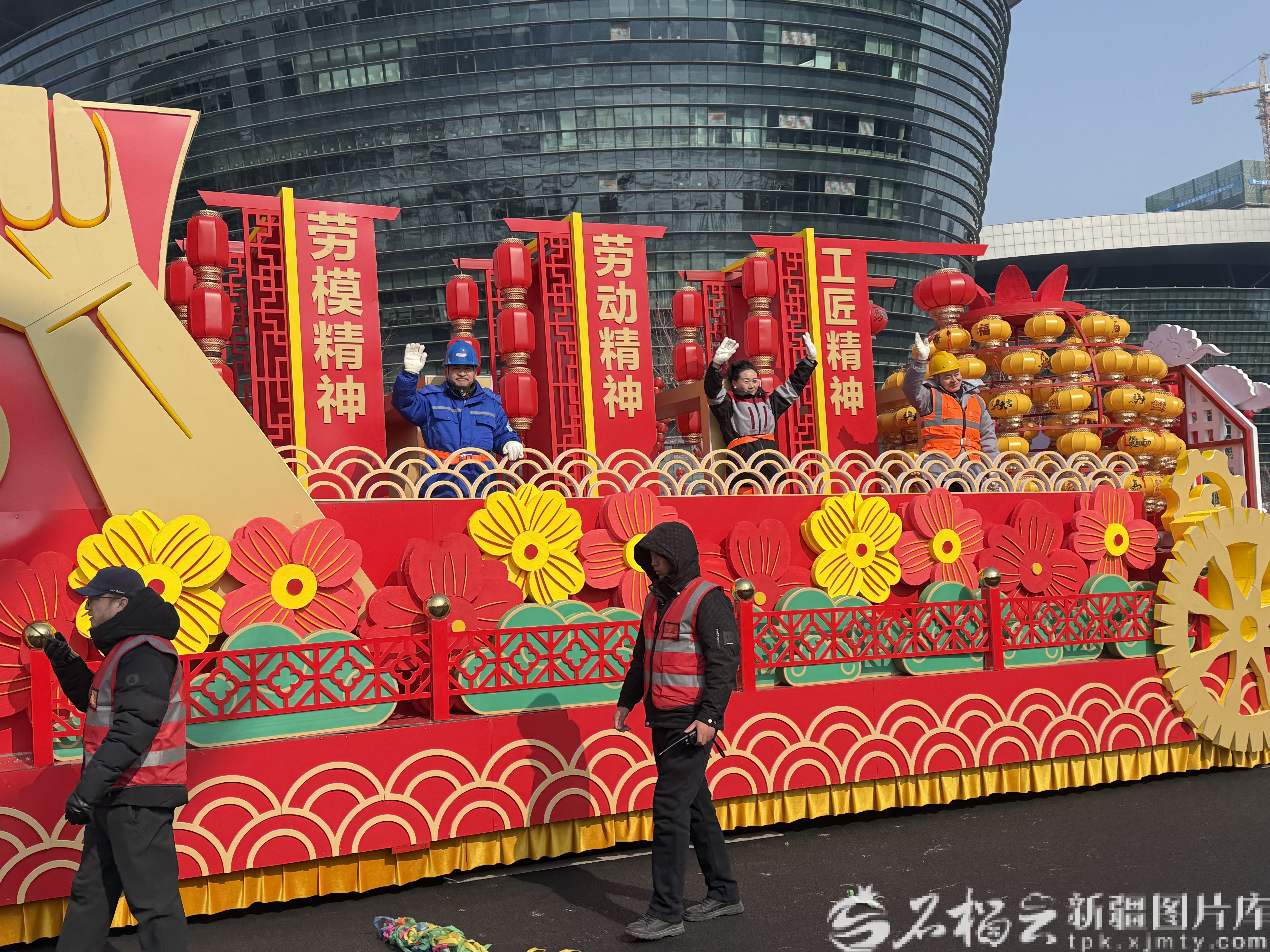 相较于传统社火巡游,本次活动创新推出的“社火队伍+主题花车”模式成为最大亮点。9辆花车以“一车一主题”为设计理念,将乌鲁木齐历史人文、高质量发展、民族团结等内容转化为直观的艺术符号。花车行进间,演员们站在移动舞台上持续表演,与沿途观众挥手互动,形成了立体化的沉浸式观赏体验。