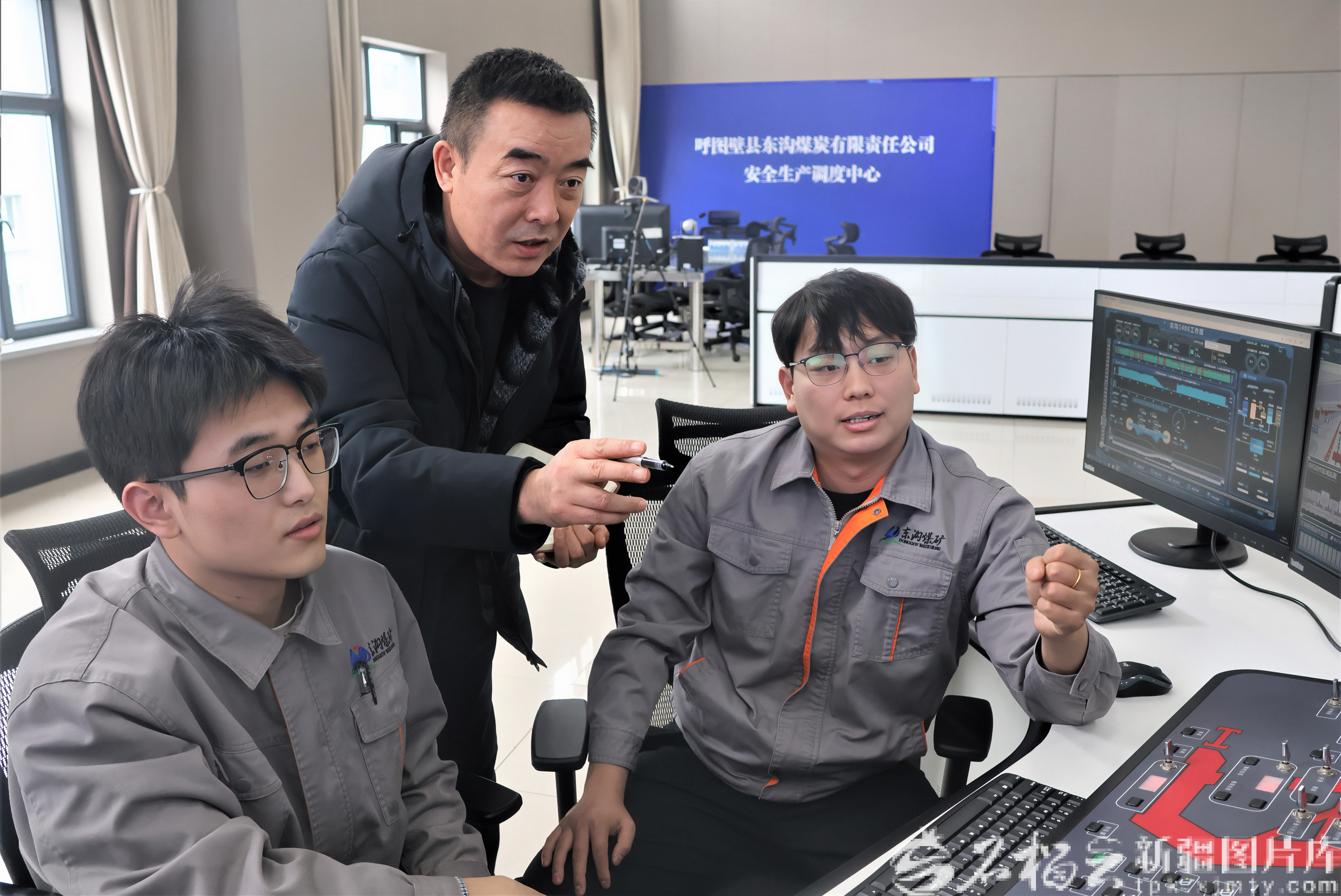 2月1日,石榴云/新疆日报记者盖有军(中)在呼图壁县东沟煤炭有限责任公司采访。程勇摄