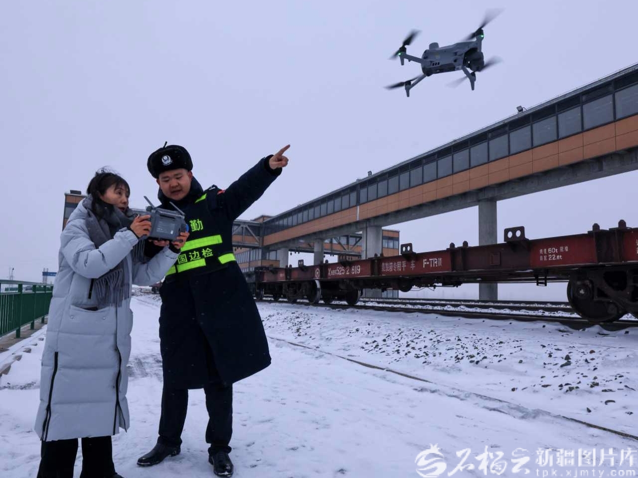 2月16日,阿拉山口口岸铁路综合查验场,石榴云/新疆日报记者白素君(左)体验用无人机查验列车。赵越摄