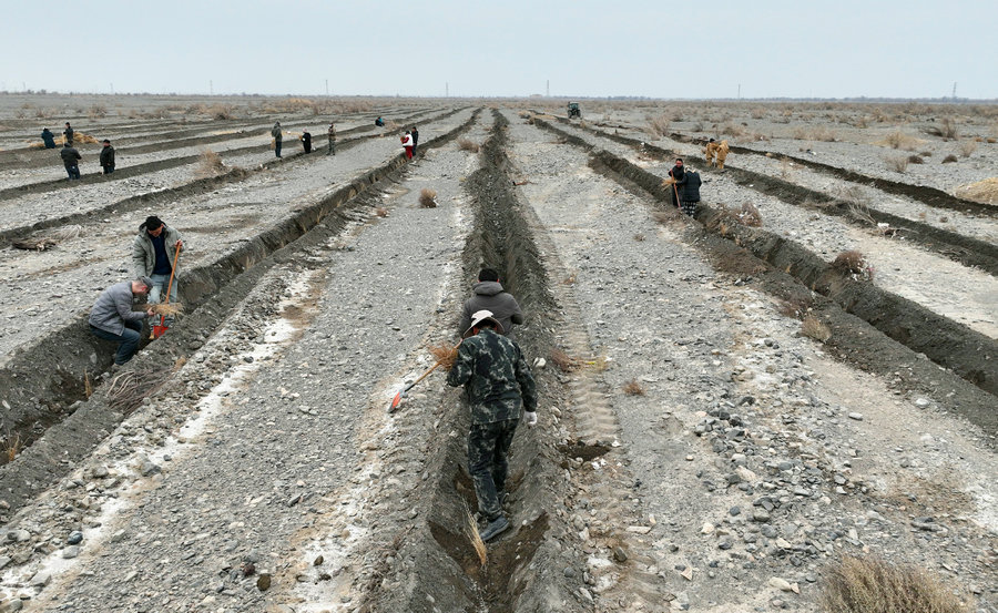 2月28日,墨玉县北部防沙治沙水源工程(一期)建设现场。刘绍斌 摄