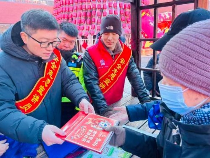 2月6日,社区便民大集上,安全志愿宣讲员为居民准备“安全福袋”,在浓浓年味中普及节日安全知识,把平安祝福送到大家手中。长安社区供图