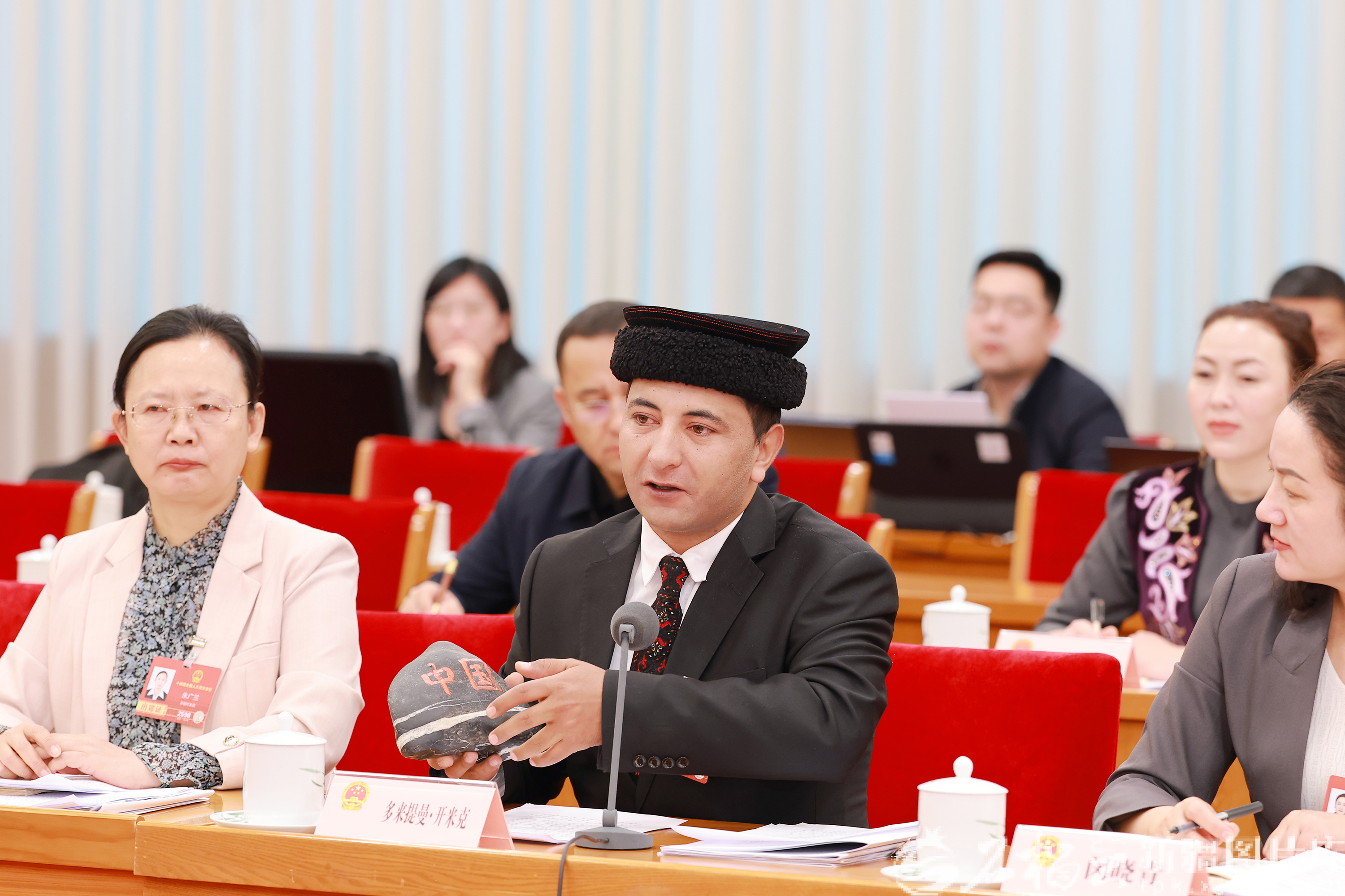 “我给大家看一块石头,这是我们护边员在巡边途中捡到的,托我带到北京来。”3月7日上午,十四届全国人大四次会议新疆代表团举行小组会议,多来提曼·开米克代表发言时,从座位旁拿起一块石头,举在胸前。
