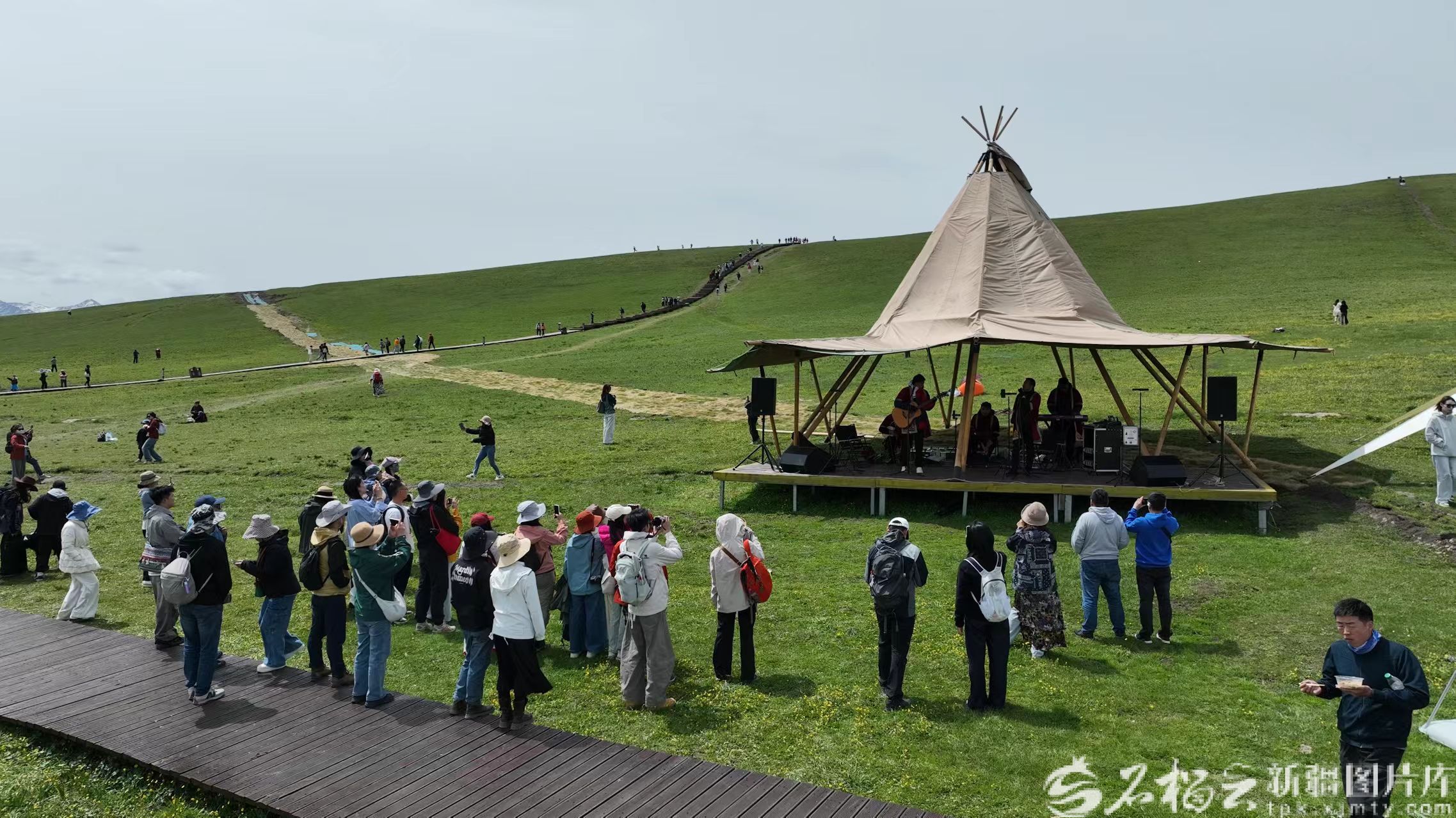 2025年6月,在喀拉峻景区,游客们驻足停留,欣赏乐队演出。 图/新疆喀拉峻投资股份有限公司提供