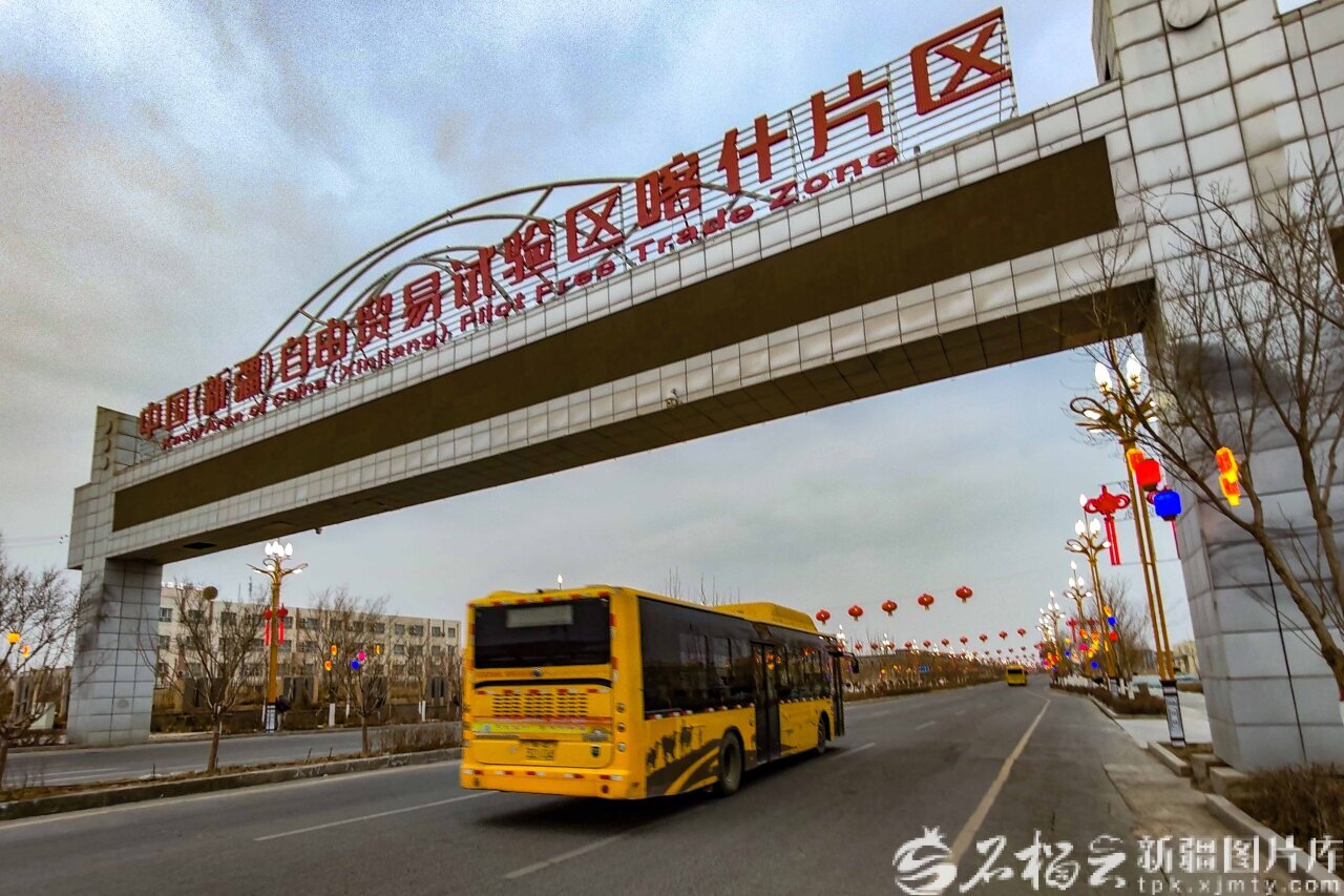 2月6日,一辆巴士从中国(新疆)自由贸易试验区喀什片区欧亚大道上驶过。资料图