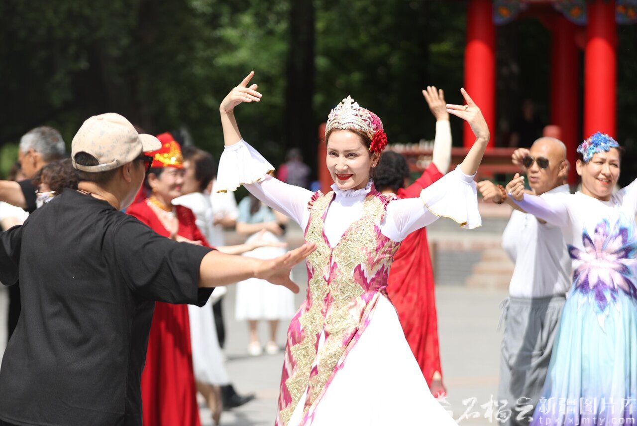 2025年6月5日,“结对亲戚”在乌鲁木齐市人民公园参与由沙依巴克区举办的“同过一个节同跳一支舞”民族团结联谊活动,共同欢庆古尔邦节。资料图