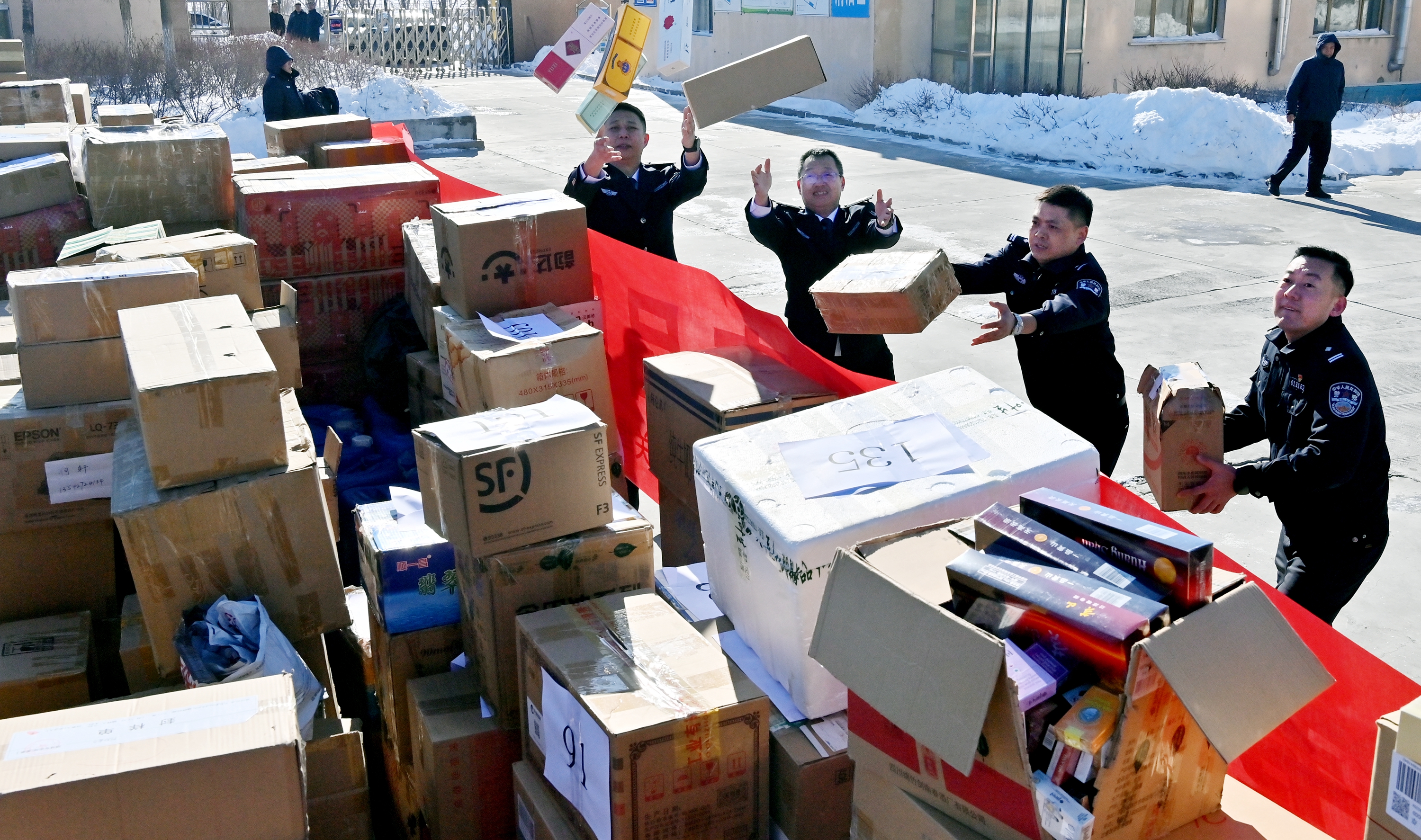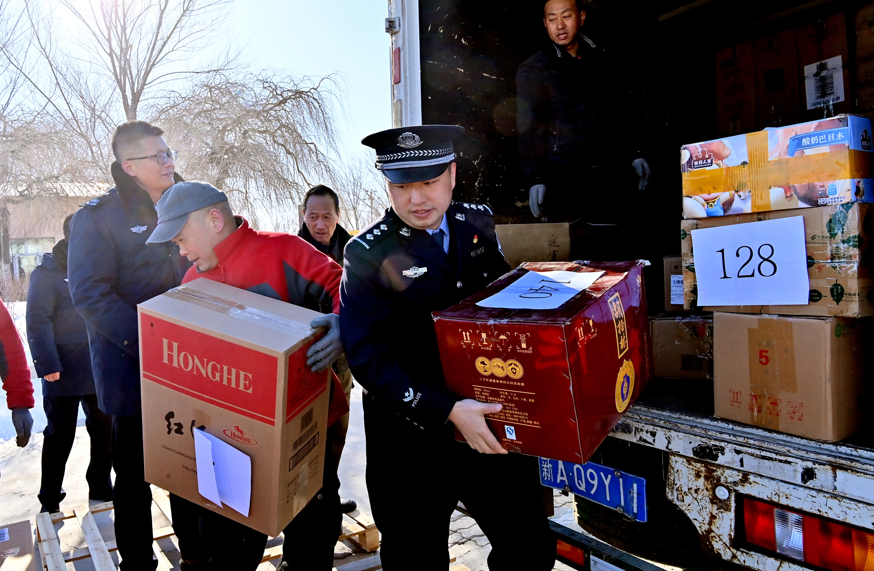 3月13日,乌市公安局环食药犯罪侦查分局民警和烟草专卖局工作人员搬运待销毁的物品。石榴云/新疆法治报记者 单坤摄