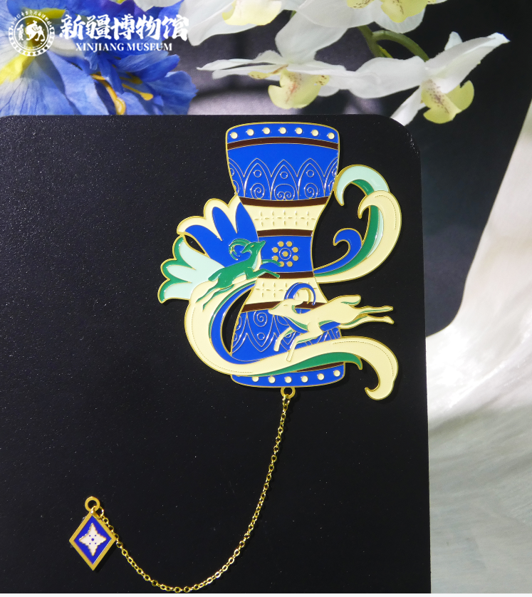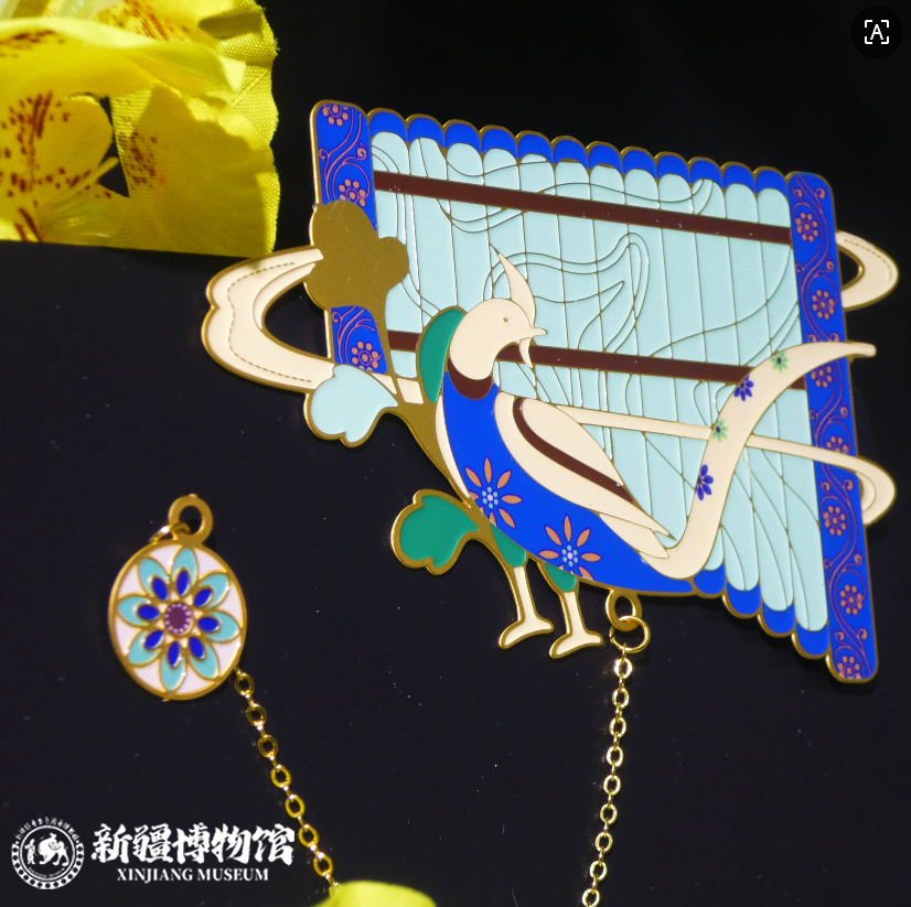 新疆博物馆文创部主任关懿介绍,这组书签共有5款,分别以排箫、筚篥、阮咸、羯鼓和箜篌为艺术原型,将龟兹壁画中的乐器形象与经典纹样、动物纹样巧妙结合,使每一枚书签均“化身”为丝路乐舞艺术的微型载体。