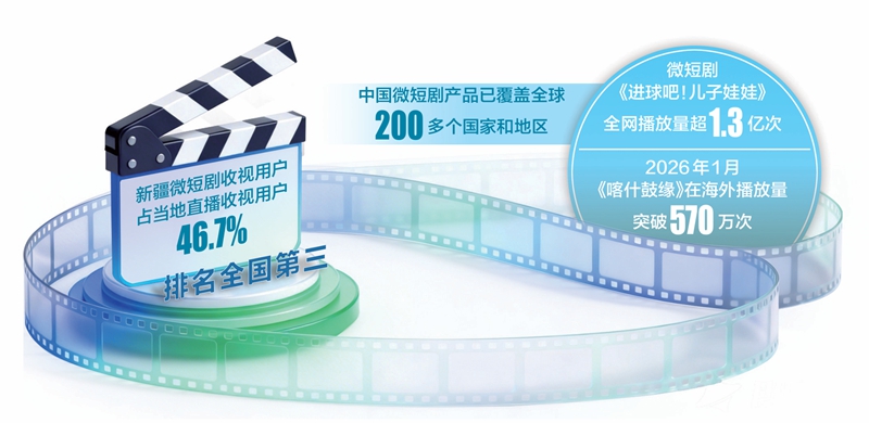 2025年11月,足球题材微短剧《进球吧!儿子娃娃》在海外播放量超200万次;2026年1月,音乐题材微短剧《喀什鼓缘》在脸书、TikTok播放量突破570万次。微短剧让中国新疆故事在全球舞台上绽放光彩。