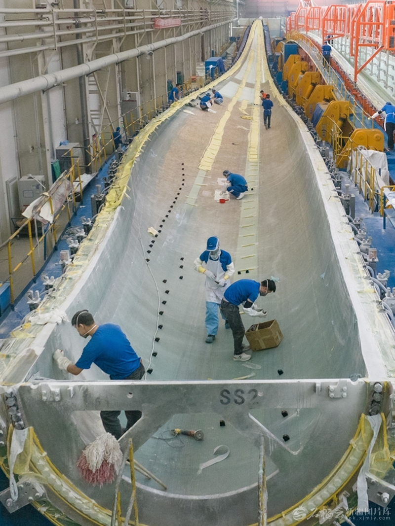 工作人员在位于昌吉国家高新技术产业开发区的新疆成飞新材料有限公司风电叶片生产基地,生产风力发电机组叶片。何龙摄