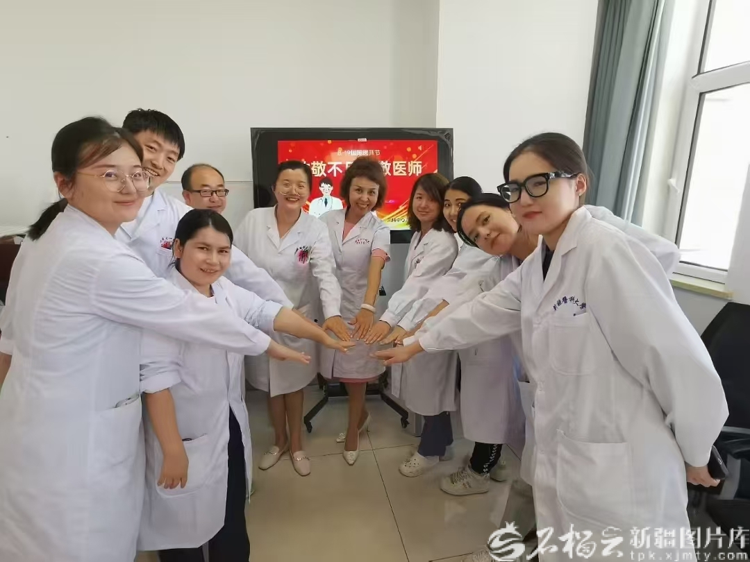 中国医师节当天,米热古丽·买买提(右五)与研究生们一起合影留念。图片由本人提供