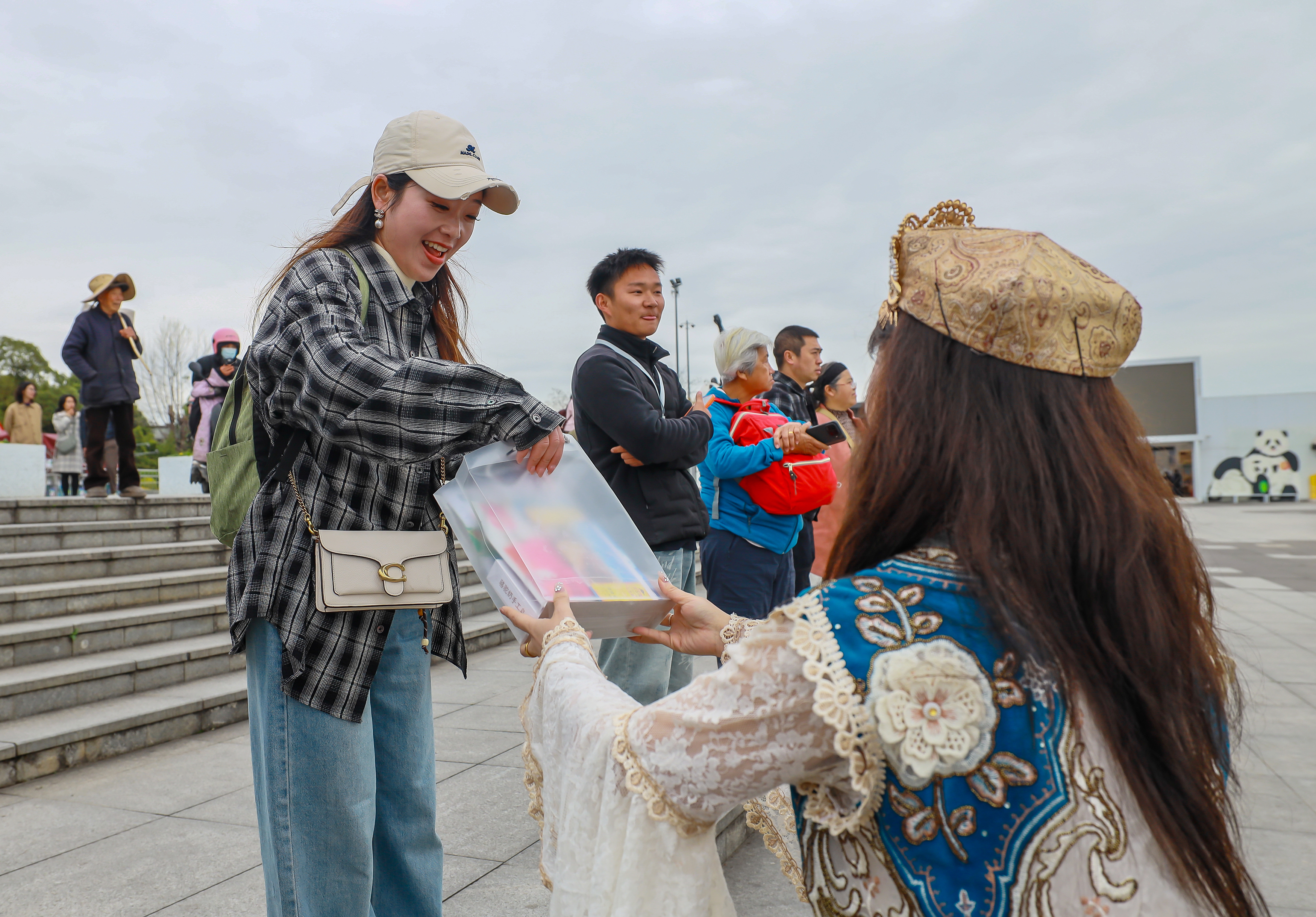 工作人员为互动游客发放礼品。