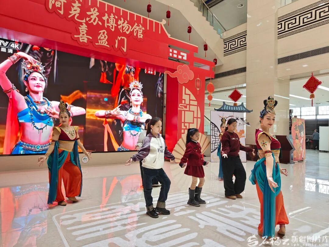 阿克苏地区文博院(博物馆)的表演者在教游客龟兹乐舞基础动作。阿克苏地区文博院(博物馆)供图