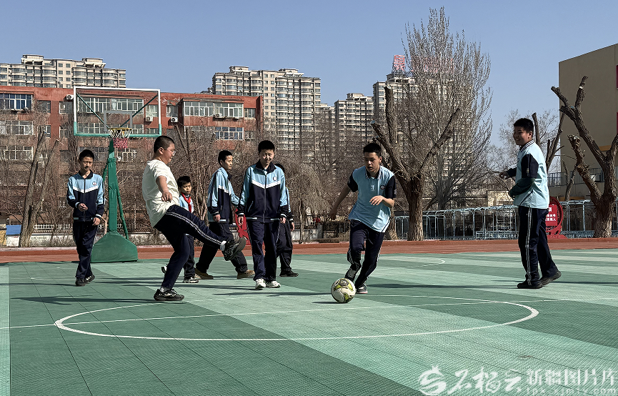 春假首日,阳光正好。“传球!快传!”“好球!”乌鲁木齐市第90中学的足球场上一片沸腾,一场由学校组织托管学生参与的足球赛正在火热进行。孩子们在绿茵场上奔跑、拼抢、传球、射门,动作虽显稚嫩,热情却很高。场边加油声、助威声此起彼伏。