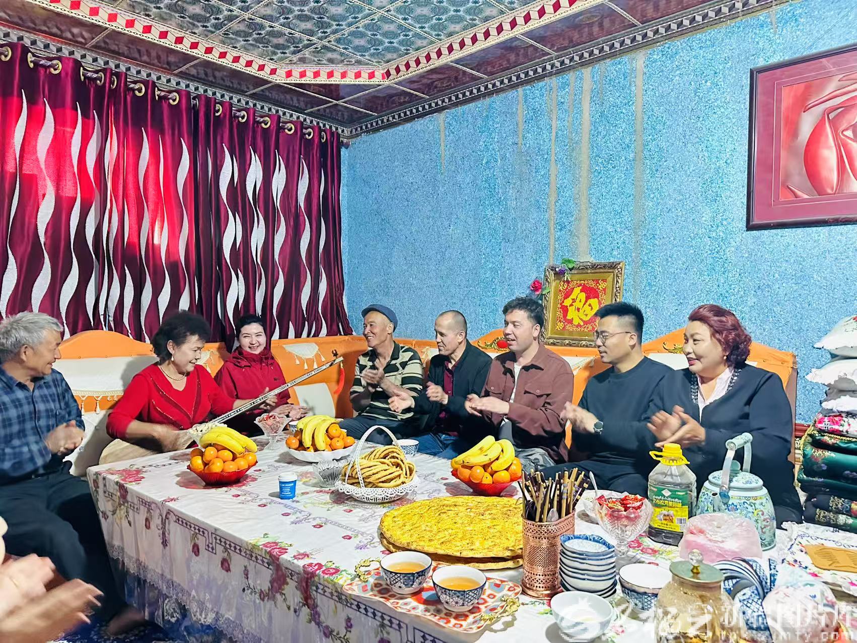驻村期间,哈万喜(右二)与同事在村民家中话家常、开展联谊活动。阿依谢姆•阿皮孜摄