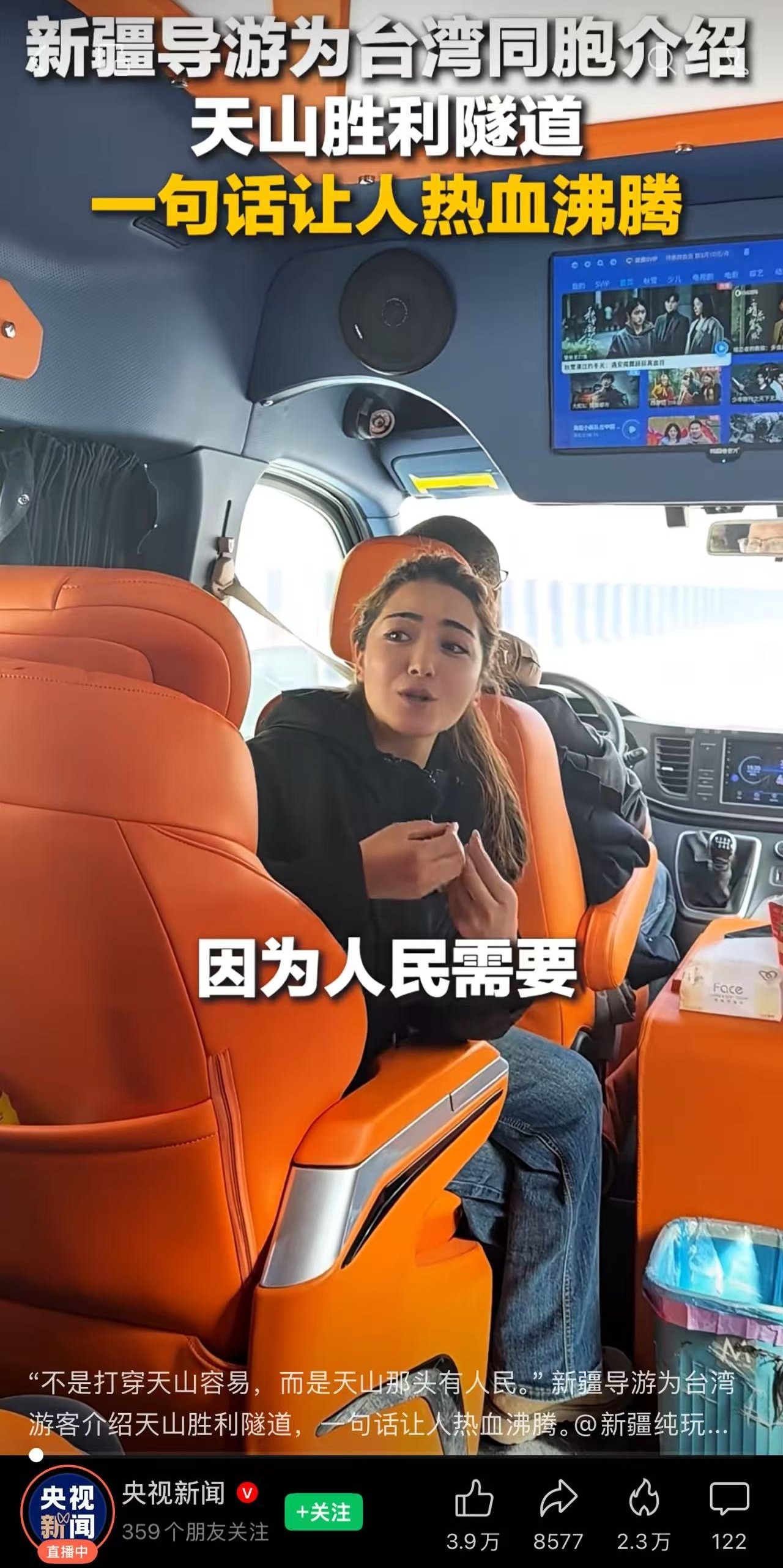 近日,一条短视频在网上火了。镜头里,一名年轻导游坐在大巴车前排,车辆行驶在世界最长的高速公路隧道——天山胜利隧道里。她面向台湾游客说了一番话:“因为人民需要这样一条好走的路。不是打穿天山容易,而是天山那头有人民……”无数网友被这句话点燃。