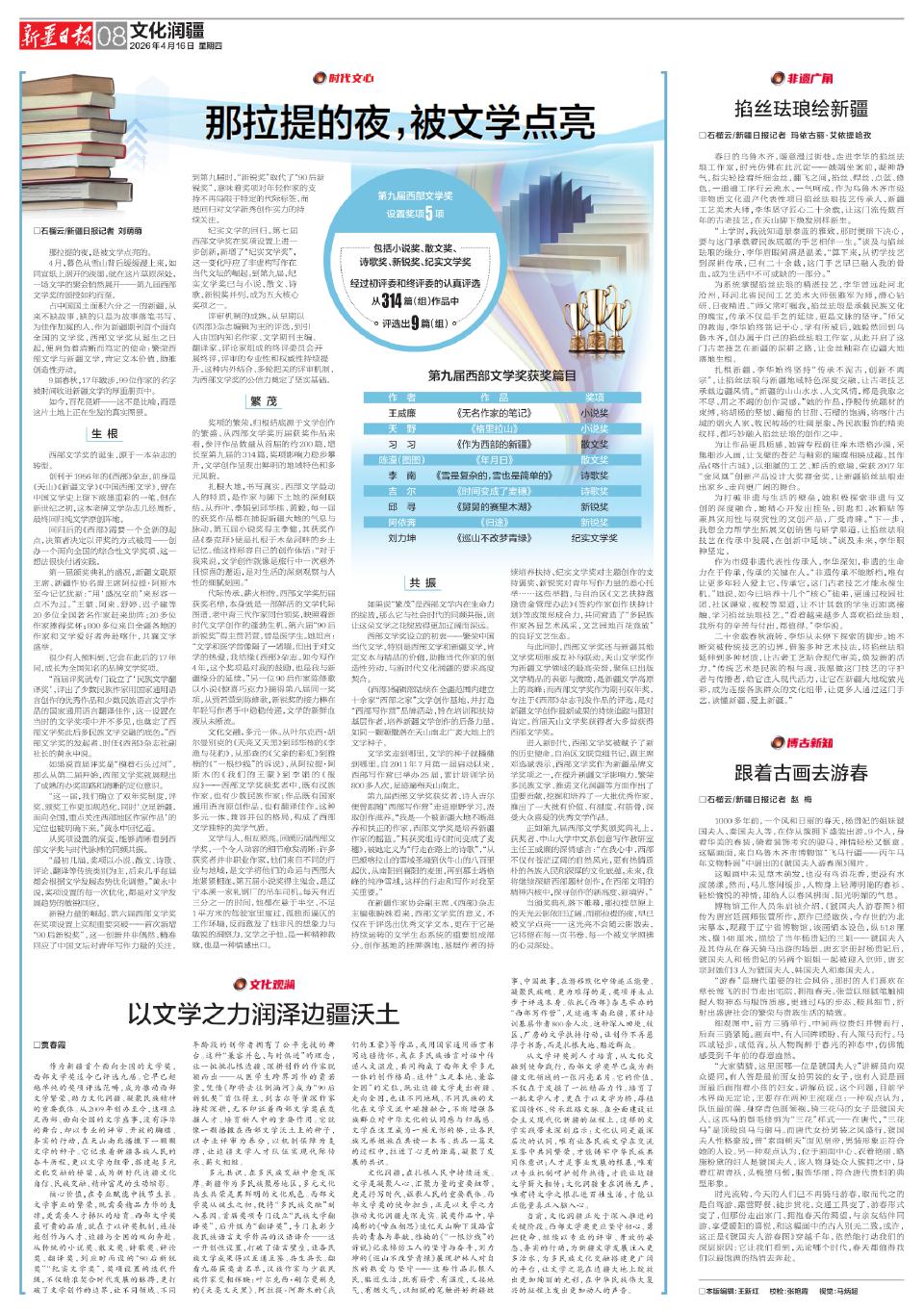 在新疆作家协会副主席、《西部》杂志主编张映姝看来,西部文学奖的意义,不仅在于评选出优秀文学文本,更在于它是持续运转的文学生态系统的重要组成部分。创作基地的挂牌落地、基层作者的持续培养扶持、纪实文学奖对主题创作的支持褒奖、新锐奖对青年写作力量的悉心托举……这些举措,与自治区《文艺扶持激励资金管理办法》《签约作家创作扶持计划》等政策形成合力,共同营造了“多民族作家各显艺术风采,文艺园地百花竞放”的良好文艺生态。