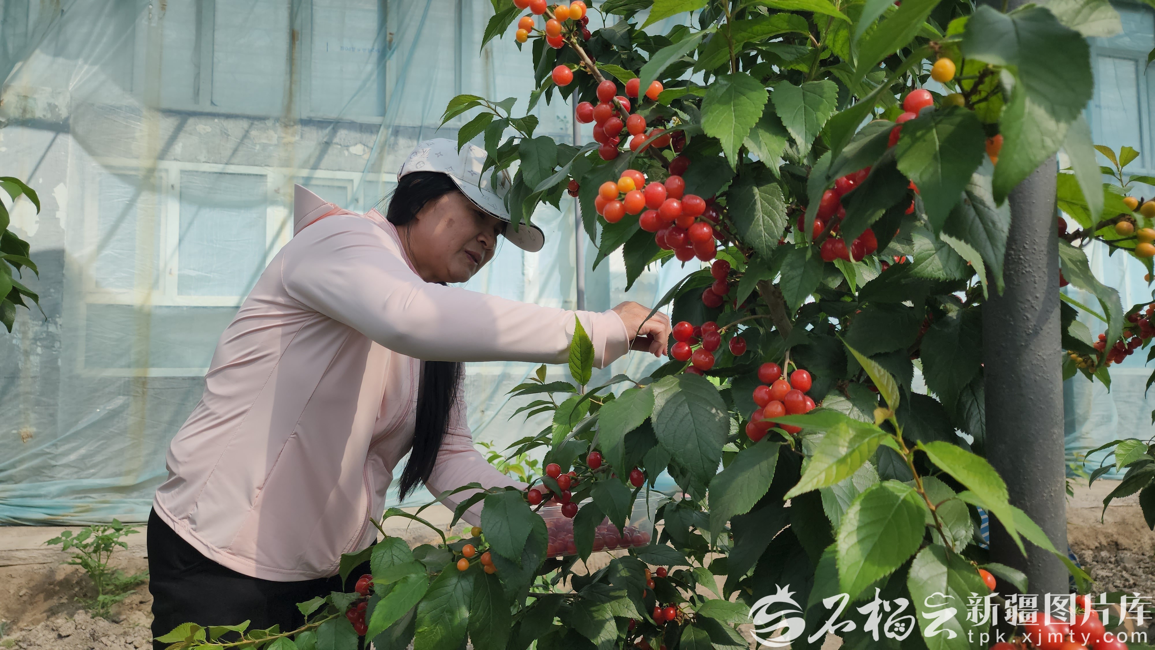 4月3日,游客在库尔勒市阿瓦提乡小兰干村英康樱桃采摘园采摘樱桃。方紫怡摄