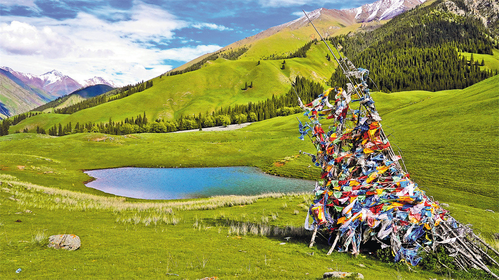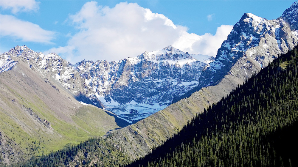 冬都精的源头处,雪山林立,冰川广布,少有人至,更是美轮美奂之地。在夏季,这里是摄影家们采风创作的天堂,也是避暑休闲地,有着蓝天白云,高大的河谷胡杨林,绿毯般的高山草甸,伟岸挺秀的云杉,遍地紫色的鲜花竞相开放,宛如一片花的海洋。