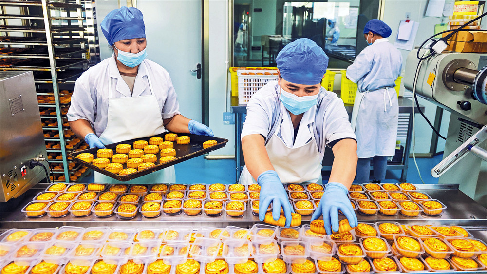 工人在产业园食品加工企业加工月饼。 (资料图)