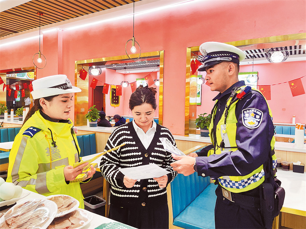 “您好,为了您的出行安全,骑电动车时请佩戴好头盔!”10月1日,温泉县兵地一条街十字路口车流如织,20岁的交警加速尔·道里坤身着荧光绿执勤服,用手势引导车流。这是他从警后度过的第一个国庆假期。