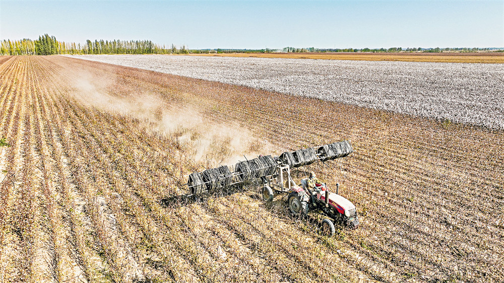 10 月 11 日,博乐市贝林哈日莫墩乡新塔拉村棉田里,滴灌带回收机将废旧滴灌带快速卷收(航拍图)。