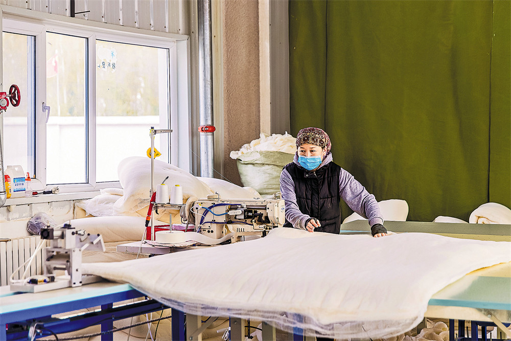 该公司位于博乐市贝林哈日莫墩乡,成立于2022年。贝林哈日莫墩乡是博乐市产棉重镇,这为生产线提供了充足且优质的絮棉原料,通过“种植端+加工端”的紧密结合,成功构建起一条从棉花到棉被的完整产业链。公司生产的新疆棉被凭借其优良品质,远销东北三省、天津、湖北等地,使棉花成为当地群众实实在在的“致富花”。 (记者楠登 摄)